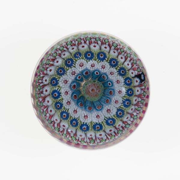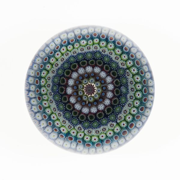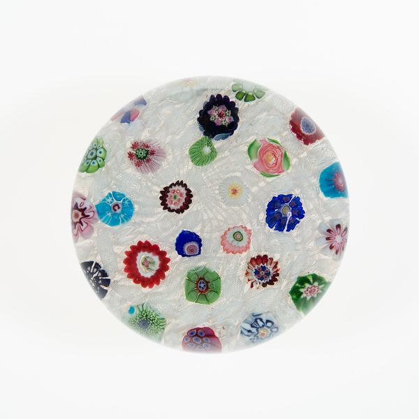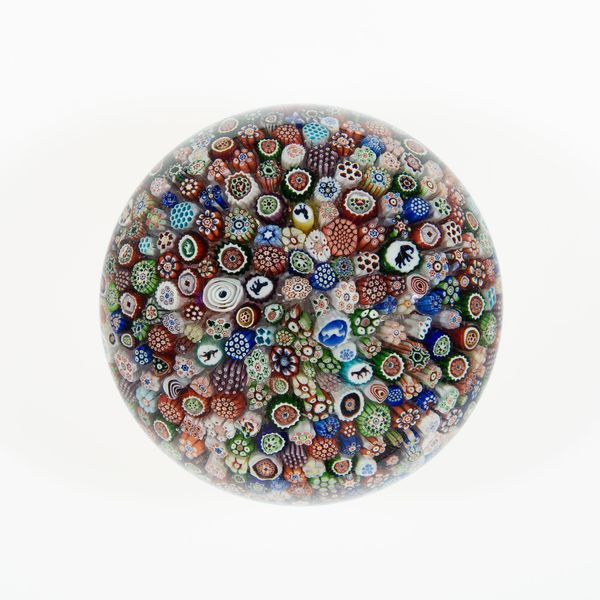 This paperweight was created by the Compagnie de Saint Louis using lampwork glass. It represents the highpoint of glassmaking as a luxury industry in nineteenth-century France. The overall effect of the paperweight is achieved through painstaking labor. Individual glass rods are bundled together into patterned canes, which are then sliced into segments and arranged in a tight, circular formation. This requires precise coordination by a team of glassworkers, each with specialized skills. The central motif, with two silhouetted figures, indicates the level of complexity involved. The entire assembly is then encased in clear glass, magnifying the intricate design. Objects like these represent a paradox. They required intense skill, but were ultimately conceived as a beautiful desk accessory, a purely decorative object. This reflects the tension between the handmade and the industrial, fine art and craft, that characterized the period. By considering the social context and the labor involved, we can more fully appreciate the intricate beauty of this paperweight.
