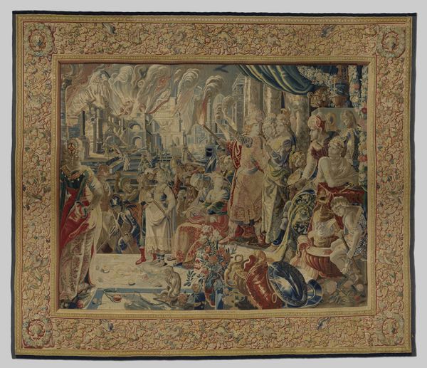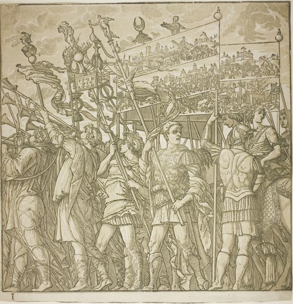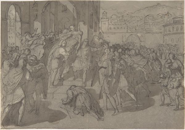 Editor: Here we have Francesco Rosselli's "The Bearing of the Cross, from Life of the Virgin and Christ," created around 1490 to 1500, using mixed media including watercolor. The somber mood and the compressed composition give me a feeling of immense tension. What do you see in this piece from a formalist point of view? Curator: From a formal perspective, consider first the function of line. Notice how Rosselli uses repeated vertical lines, especially the spears, to create a sense of oppressive depth, drawing the eye towards the upper reaches of the picture plane. And how the contrasting curved lines of figures in the foreground adds to a sense of dynamism, albeit constrained by the overall composition? Editor: Yes, I see the lines converging, adding to the feeling of compression. How does the color play into this? Curator: The muted watercolor palette, dominated by blues, grays, and browns, creates a flattened picture plane and lends to a somber mood. A brilliant, flagrant contrast emerges when considering the strategically placed dashes of red, drawing the eye toward a culmination of violence implied, if not overtly shown. Do you observe how the application of color affects depth? Editor: I think the color choice reinforces that overall feeling of oppressive weight that I noticed initially. It's interesting how you analyze the lines and color as compositional elements, directing how we, as viewers, should feel when looking at the artwork. Curator: Precisely. We begin to unravel its impact through these close visual readings. Form isn't just about appearance, but how appearance dictates meaning, experience. Editor: Thanks for guiding me. I am now encouraged to go and analyze different aspects of the artwork, focusing on the artistic components instead of searching for narrative meaning first. Curator: That is how a deep understanding of art begins! It's all about understanding and appreciating structure.
