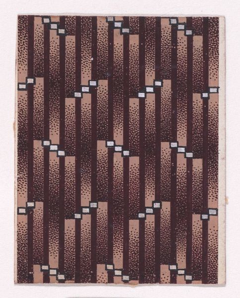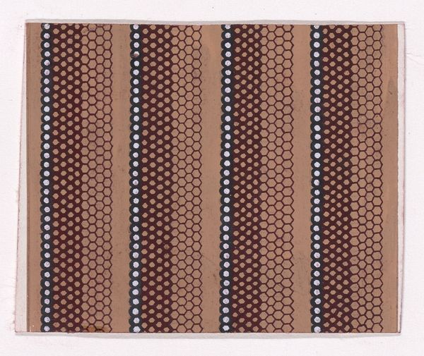 Editor: We're looking at a piece titled "Sheet with diagonal stripe pattern" made sometime between 1800 and 1900 by an anonymous artist. It's a drawing, or maybe a print, and is currently at the Metropolitan Museum of Art. I’m immediately struck by how simple yet mesmerizing it is – like something you could get completely lost in. What do you see in this work? Curator: Mesmerizing, yes! It makes me think about how seemingly simple forms – just stripes and dots – can hold such power. I wonder about the maker, someone carefully, repetitively applying these marks. Is it meditative? Mundane? Consider the historical context too – the explosion of textile design happening at this time, patterns travelling the world, influencing each other. Does the work remind you of anything in particular? Editor: I see how the regularity would almost be meditative, creating your own visual rhythm! The way you describe "textile design" really rings true and feels almost industrial, even if this wasn't made by a machine. Does this pre-figure digital screens and repetitive elements? Curator: I love that, thinking of screens! It's a reminder that humans have always been drawn to pattern, to organizing chaos. Perhaps this artist, whoever they were, tapped into that deep-seated human desire. I can also imagine that the irregularities also point to an organic making and "pre-industrial" method. Do you have any feeling about where it might come from or for whom? Editor: The limited color palette makes me think maybe a small workshop creating things affordably or with access to only so many natural dyes. Thinking now, it’s also not clear the image’s function. Is it decorative, a design proof, an art object? Curator: Exactly! Its purpose remains intriguingly open. This little, somewhat unassuming, piece is packed with potential narratives. The simplicity also lends itself to different contexts of reception over time... Editor: Absolutely! So, starting out it looked like just a set of marks and now its full of stories, textiles, even computer screens. Thanks for opening that up! Curator: It’s been fun, thinking together about where the humble design of the piece might come from!