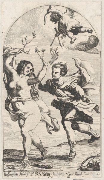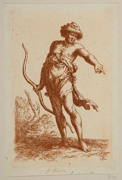 Editor: This etching from the series 'Figurine' by Salvator Rosa, dating back to sometime between 1651 and 1661, depicts a partially dressed man with a bow. He has a very assertive stance and he's pointing off into the distance. What do you see in this piece? Curator: This etching offers a glimpse into the construction of masculinity during the Baroque period and beyond. Rosa was playing with the archetype of the virile hero. Consider the tension: partially clothed, vulnerable in a sense, yet powerfully armed and confidently gesturing. Where does this positioning originate, and what power structures does it reinforce? Editor: The tension between vulnerability and power makes a lot of sense, but how does this play into history-painting or societal conventions of the time? Curator: The theatricality, the pose...it invites us to unpack the layers of performance inherent in identity. How much of our understanding of ‘heroism’ or ‘leadership’ is, essentially, a carefully constructed image meant to inspire or perhaps even intimidate? Rosa presents an ambivalent figure; consider the performative nature of power, then and now. Does he offer commentary or endorsement? Editor: I suppose that's where the historical context would clarify the intention, if possible. So, would you say Rosa is prompting a critique of power? Curator: Exactly! Rosa invites critical questioning of how power is projected and perceived through artistic representations, revealing how identity itself is built through cultural narratives. I wonder what performative aspects of identity most resonate with contemporary audiences... Editor: I’ll definitely be looking at Baroque art through a different lens from now on. Thanks for sharing this fresh perspective! Curator: And thank you for prompting this analysis! Considering the image in a sociopolitical context provides it a new and transformative dynamism.
