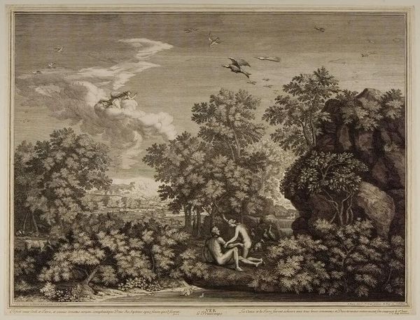 Curator: This is "Dido and Aeneas," figures engraved by Francesco Bartolozzi, housed here at the Harvard Art Museums. Editor: It feels like a stage set, a tempestuous scene frozen mid-performance. Curator: Indeed. Bartolozzi masterfully uses light and shadow, creating a binary opposition between the idyllic landscape and the dramatic embrace, evoking a sense of impending doom. The composition draws the eye to the couple, set against the backdrop of nature. Editor: There's an emotional rawness in the way their figures are rendered. The looming darkness definitely amplifies the tragic love story. I get a sense of longing mixed with desperation. Curator: Precisely. The engraving technique adds a layer of complexity. The contrast is stark, highlighting the preordained tragedy embedded in the narrative. Editor: It's funny, even knowing the story, seeing it framed this way, it stings anew. Curator: Well, there we have it. Editor: Quite.