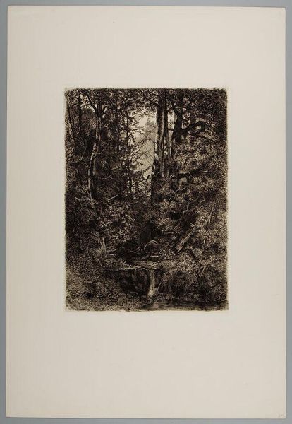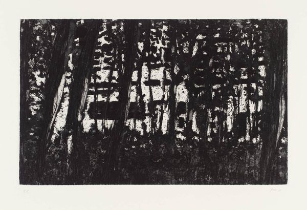 Editor: This untitled etching by Christopher Le Brun presents a dark, almost dreamlike forest. What historical context might shape our understanding of such a seemingly personal scene? Curator: Consider the resurgence of interest in Romanticism during the late 20th century. Le Brun's work echoes that movement, rejecting the cold rationality of modernism. How does this image challenge or reinforce traditional notions of landscape art as a celebration of nature, and what socio-political factors might influence this? Editor: It's less about celebrating nature and more about exploring its darker, more mysterious aspects. It is almost as if we are not welcome there. Curator: Precisely! This could be interpreted as a commentary on the environmental anxieties of the late 20th century. Perhaps it's a reflection of our troubled relationship with the natural world. Do you agree? Editor: That makes a lot of sense! I had not thought about it that way, but now I see the connection more clearly.