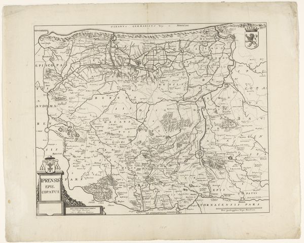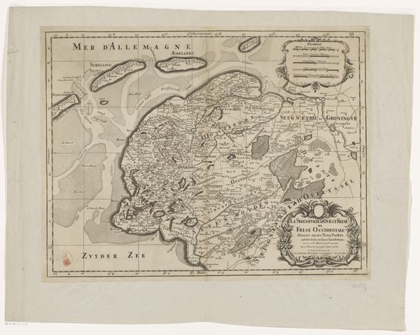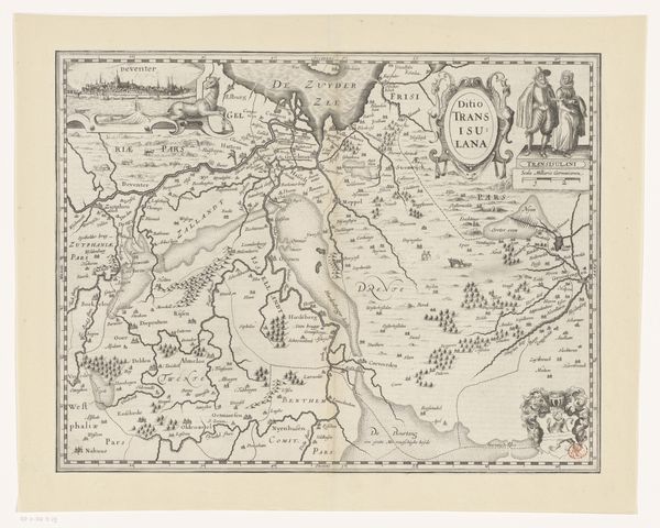 Editor: We're looking at a piece titled "Kaart van het graafschap Vlaanderen, met een gezicht op Gent," a map of the County of Flanders with a view of Ghent. It was created between 1617 and 1622 by an anonymous artist and the medium is engraving. It's incredibly detailed, almost overwhelmingly so at first glance. What structural elements stand out to you in this composition? Curator: Indeed, the sheer density of visual information demands close scrutiny. Observe how the composition is rigidly structured. The prominent, framed map is dominant, while subsidiary imagery – figures and city view – occupy distinctly separate registers. Notice also the strategic placement of cartouches. Consider how such compositional devices contribute to the artwork’s semiotic function as both descriptive geography and emblem of political authority. Editor: Political authority? Curator: Absolutely. Note how the sharp, clean lines of the engraving lend an air of precision and control, reinforcing a sense of dominion over the depicted territory. Consider how the Baroque style informs not just aesthetic choices but also communicates power dynamics through form itself. Is that not telling? Editor: It is! I see now how the strict organization reflects a desire to impose order, both literally on the landscape and symbolically through artistic representation. Curator: Precisely. By deconstructing its visual components, we can understand this map as more than just geographical data; it’s a powerful statement about control and knowledge. Editor: That's fascinating. I initially saw it as just a historical document, but looking at its structure reveals so much more about its purpose. Thank you for that perspective. Curator: It is through such formal dissections that the essence of any artistic endeavor can be accessed, would you not agree?