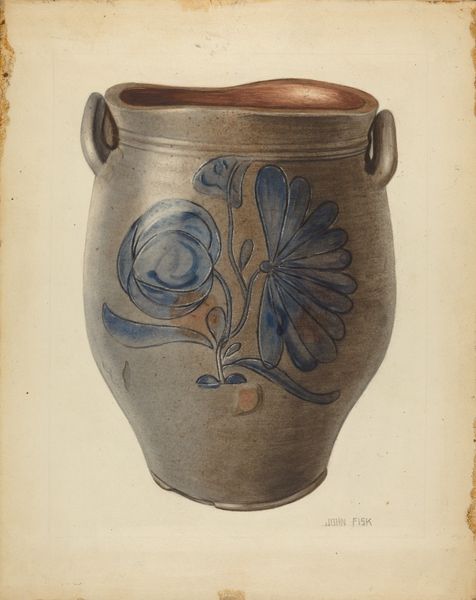 This Crock was produced by John Tarantino, who lived from 1855 to 1995. Although the date of production is unknown, the crock is made from humble materials like clay, and traditional techniques. It is clear that the artist or artisan had skill in working with clay, shaping it on a wheel, adding handles, and applying a cobalt decoration. The floral motif and the color blue became incredibly popular in utilitarian stoneware in the late 1800s, with many artists taking different stylistic approaches to these traditional works. This kind of pottery was functional, made to hold food or liquids, but it was also an opportunity for creative expression. The labor involved in digging the clay, preparing it, forming the pot, firing it, and painting it speaks to the value placed on handmade objects in a time of increasing industrialization. The resulting object blurs the lines between art and craft, design and utility. Understanding how things are made, and the context in which they are made, allows us to appreciate the social and cultural significance of everyday objects like this crock.