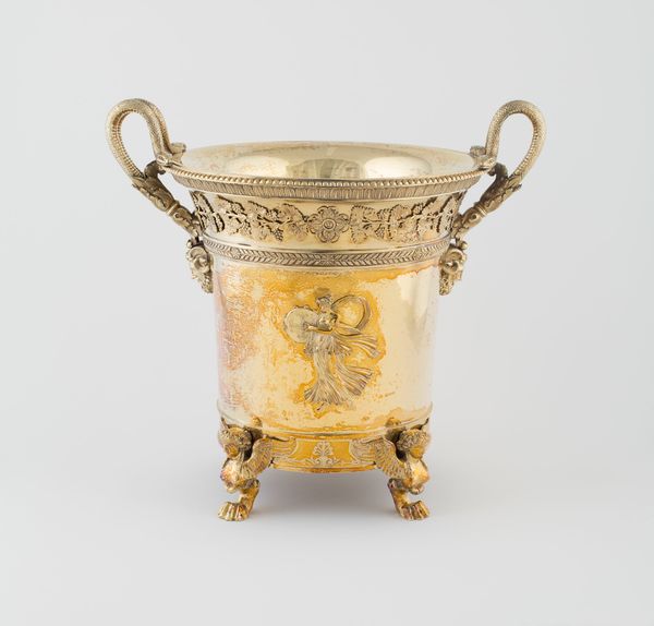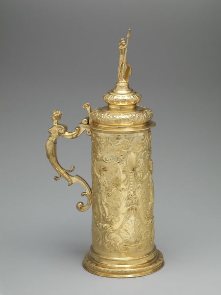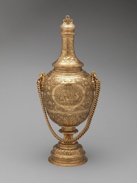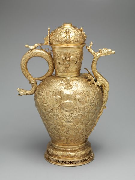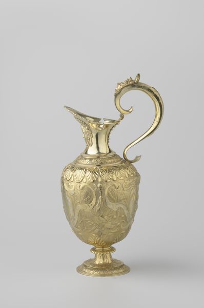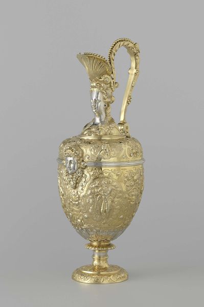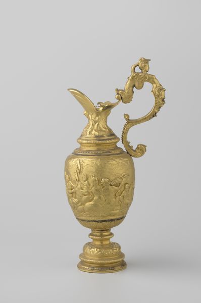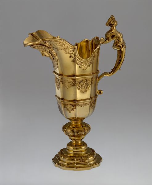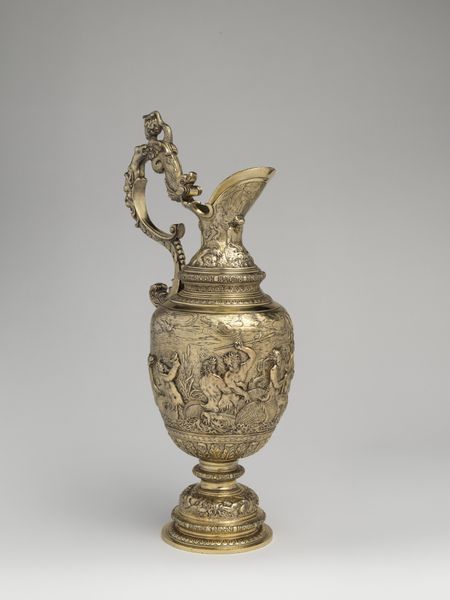 This ewer, currently held at the Metropolitan Museum of Art, was crafted by Franchi and Son. Its gleaming surface catches the light, revealing the intricate details of its form. The ewer is structured with distinct zones: a pedestal base supporting an ovoid body, crowned by a sculptural female figure. The eye is drawn to the relief work covering the body, where scenes of classical inspiration wrap around. Above, a frieze of medallions adds rhythmic complexity. The handle, arching gracefully, mirrors the curves of the ewer's body. The artists play with scale and proportion here. The figure at the top is both part of and separate from the vessel, a semiotic dance that challenges fixed meanings, and invites us to rethink the relationship between form and function. The rich ornamentation, rather than merely decorating, becomes integral to the ewer's presence. It is in the interplay between these elements that the ewer achieves its power, inviting ongoing interpretation and appreciation.