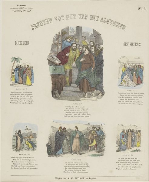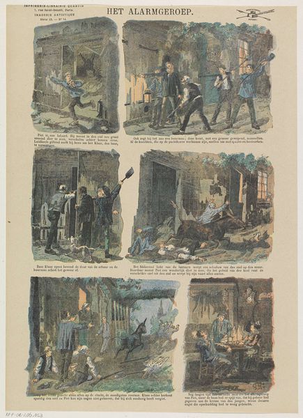 Editor: This lithograph, titled "The Fearful Soldier," created sometime between 1876 and 1898 by Eugène Chaperon, presents a series of scenes depicting a rather unfortunate military mishap. The scenes create a whimsical effect but, knowing the history of conflicts, I find that juxtaposition somewhat unnerving. What’s your interpretation of Chaperon’s visual story? Curator: What strikes me immediately is how Chaperon uses this seemingly humorous narrative to perhaps critique military institutions. Consider the setting: stark guardhouses and watchful figures suggest the rigid structures of military life. Now, consider the "fearful soldier" motif throughout. This figure appears consistently outwitted, highlighting incompetence, or perhaps disillusionment, within the ranks. Could this print be a subtle commentary on the often-absurd realities of power and order within military contexts? Editor: That’s interesting. So, the humor might be a mask for a more serious point about institutional failings or even a subtle protest against militarism itself? I hadn’t considered that. Curator: Exactly! These genre paintings can offer powerful socio-political statements, cloaked in relatable or humorous scenarios, inviting viewers to consider how institutions function and impact individuals within society. Notice too the narrative structure, how the artist chose to portray specific moments, framing and orchestrating the overall experience. Do you think that framing invites critical reflection, or simple entertainment? Editor: Now that you point it out, the episodic layout does make me think about political cartoons from that era; the print format also supports broader circulation to make political commentary accessible to everyday people. I see it now! Curator: It’s all in observing these nuances. Art is powerful in how it helps people reflect about society's expectations and institutions, past and present. Editor: Absolutely, and thanks to this discussion, I understand the purpose and significance of the lithograph much better now. Curator: As do I, that has also made me think more deeply about it.