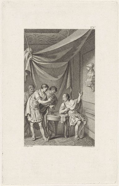 Curator: The artwork we’re observing here, residing at the Rijksmuseum, is an engraving from 1833 entitled “Huwelijk tussen Apollo en een jonge dame,” or "Marriage between Apollo and a young lady," created by Daniël (I) Veelwaard. Editor: Well, my immediate reaction is that it's staged, and slightly absurd. Apollo looks stiff, the bride seems rather bland, and that character to the left has such a grotesque profile, so unlike classical figures. It gives a slightly satirical impression. Curator: I find that's precisely the point. Veelwaard operated within a neoclassical context but wasn’t beyond injecting social commentary through the art. While classical subjects gained traction and lent themselves to the aesthetic, it was frequently appropriated for political or social purposes. Notice the engraver, officiating the contract, represents, perhaps, not the purity of love, but the transactional and controlled aspects of marriage? Editor: True, but Apollo looks less like a radiant god of poetry and light, and more like a stage actor awkwardly holding a prop bow. He is there just to provide the classical touch, while the image says something else about control of love through legal agreements and the social role it represents for men and women. What about her apparent lack of excitement about this union with a god? Her eyes and pose show sadness more than happiness. Curator: Indeed, and if you examine other artworks from this time period that feature marriages or unions, especially of notable figures, you might find they exhibit a specific degree of staged-ness and emotional remove. Public art had a civic duty: so to show personal, complex emotion perhaps flew in the face of creating acceptable public image. The woman looks unhappy in the presence of a smiling man which serves as contrast between legal rights versus the lack of emotion. Editor: I see that. Knowing more about its creation during that historical period definitely sheds a new light on the artwork. While on first view I see caricature and bad acting, a closer look at its context does illuminate themes of control, contracts and a questioning about the roles involved. The artist's decision to use engraving to recreate an otherwise classical representation of Apollos reinforces, to me, those statements of institutional control. Curator: It's those very societal influences—political undertones embedded within classical idealism—that keep "Huwelijk tussen Apollo en een jonge dame" a compelling case study, I think, for art and its public role. Editor: And it reminds me of how important it is to look beyond surface representations, in any art piece. Thanks for walking me through this one!