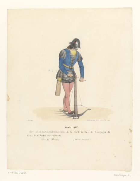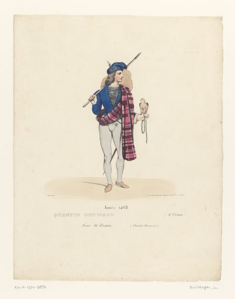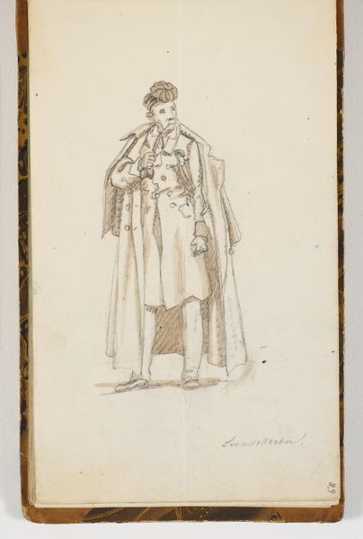 Louis Boulanger created this costume design of Louis XI in the 19th century with watercolor and graphite on paper. The drawing depicts the king in relatively humble garb: a simple woolen bourgeoise robe and felt hat. There's a stark contrast between the king's actual status and the materials represented here. Wool and felt were common textiles, accessible to many, which democratized fashion. This choice reflects a conscious decision to portray Louis XI as more relatable to the common person, an approach that would have resonated with the 19th-century audience. Boulanger's design is about the idea of the king rather than the king himself. The drawing makes a social statement, emphasizing humility and accessibility, thus blurring the lines between historical accuracy, theatrical presentation, and social commentary. It underscores how clothing, even for a king, can be a powerful tool for shaping perception and reinforcing political messages.