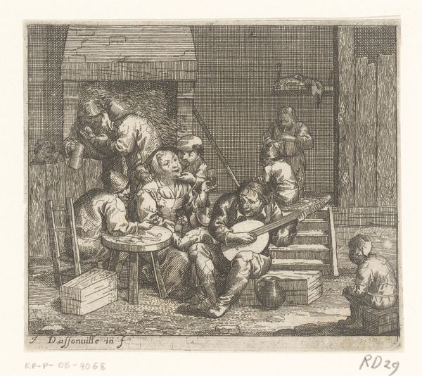 Editor: This etching, "Scene in an Inn" by Jacques Dassonville, created sometime between 1629 and 1670, gives such a vivid impression of daily life. The composition feels almost claustrophobic, packed with figures. What stands out to you? Curator: The symbols here speak volumes about societal values. Notice the way the figures huddle together. What do you think that says about the community's perception of comfort and security? Editor: It definitely feels like they are seeking companionship, especially in what appears to be a boisterous, almost chaotic environment. Is that typical of genre scenes from this period? Curator: Precisely. It goes deeper. Consider the pipes and drinking vessels. These were not merely props; they were imbued with connotations of leisure, social status, sometimes even moral laxity. Their presence here speaks to a certain accepted culture of relaxation. How might those items have been perceived at the time versus now? Editor: Interesting. Today we might see it simply as people enjoying themselves, but then it could be interpreted with more judgment, maybe even as commentary on social behavior. Are the children doing anything symbolic? Curator: They could hint at inherited destinies, caught within the social environment that dictates a certain mode of existence. Editor: That's powerful. So, by studying these details, we are actually decoding a complex cultural narrative hidden within an everyday scene? Curator: Exactly! It’s a reminder that art is so much more than what initially meets the eye. It’s cultural memory etched in visual form. Editor: This makes me look at genre paintings in a completely different light. Thank you for highlighting these cultural nuances; it's definitely changed my perspective.