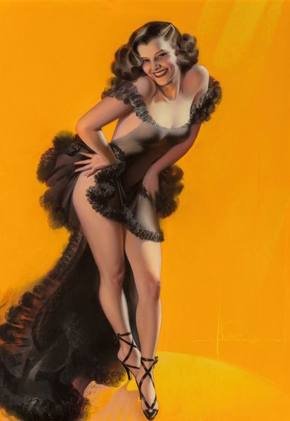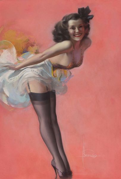Editor: Gil Elvgren's "I Must Be Going To Waist," painted in 1946 using oil paints, depicts a woman struggling with a garment. It feels playful, and a bit cheeky, I suppose, but what jumps out at me is the obvious attention given to details, and this fantastic light that gives it an interesting mood. What do you see in this piece, beyond the obvious pin-up aesthetic? Curator: Oh, it's so much more than just a pin-up, isn't it? Elvgren was a master of capturing a specific moment, an implied narrative. It's the "oops, caught in the act" that grabs the viewer, a wink and a nudge, you know? Think about the post-war era—the optimism, the burgeoning consumer culture. He's selling a fantasy, sure, but also tapping into a real sense of desire and humor. Do you notice how the light focuses almost exclusively on her? It really emphasizes her femininity. Editor: Absolutely, it's strategic, for sure. And the implied story, as you call it…it works, definitely! Curator: Right! The skill is deceptive, really. Academic art informed his painting – and he was very good at what he did. But there’s something almost self-aware about his works… Almost poking fun at that same consumerist desire he feeds. What do you make of that present sitting next to her? Editor: A gift. Definitely a romantic gesture to impress a partner. It’s a nice complement to her attire – very telling, the whole setup, actually. I can also see how one could make it darker with, you know, like, objectification and such. Curator: Yes, well, art often holds a mirror to society, reflecting both its beauty and its flaws. It’s all in the viewer’s eye and what they see or want to see! I guess you have a point, and I never considered that. Thank you for this moment of awareness. Editor: Thanks, it was insightful to see how different art periods influenced even works like this.