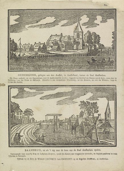 Editor: Here we have Carel Frederik Bendorp's "Twee dorpsgezichten te Wommels met Grote Plein en Nederlands Hervormde Kerk," an etching from sometime between 1786 and 1792. The monochromatic texture gives it an intimate feel. How do you interpret the way the artist uses line and composition here? Curator: The organization of the two scenes is notable. The upper register, “Het Groote Plein te Wommels,” features a relatively expansive horizontal composition, emphasizing the width of the town square, and a stark contrast to the lower, “Wommels Langs de Kerkt Ezien,” which offers a verticality established by the imposing church tower. Observe the foreground: In the upper image, the figures are engaged in labor, dispersed and almost absorbed into the landscape; in the lower, we have individuals walking along a path, offering a distinct sense of depth. Does this differentiation in plane and depth influence the reading of narrative here? Editor: It seems to separate public life from the life of the Church. What I find really striking is the cloud work; they're practically mirror images of one another! Does that tie into what you're saying about narrative? Curator: Precisely! The compositional echo between the cloudscapes is hardly accidental. Consider the texture; the almost chaotic hatching that creates movement. These techniques pull the viewer back into the entirety of the plane. By drawing the eye towards an appreciation of composition, Bendorp pushes the symbolic narrative aside in favor of aesthetic observation. Editor: So, less about storytelling, more about… formal relationships? Curator: In essence. The narrative element acts as a support for what the formal play achieves. How might an artist’s choice of print medium emphasize these compositional considerations over explicit political content? Editor: Well, focusing on form really lets us appreciate Bendorp's work outside the context of its time. I think I see how focusing on formal relationships unlocks the lasting relevance of works such as this one. Curator: Indeed. The orchestration of line, form, and plane creates an evocative reading that remains potent regardless of shifting contexts.