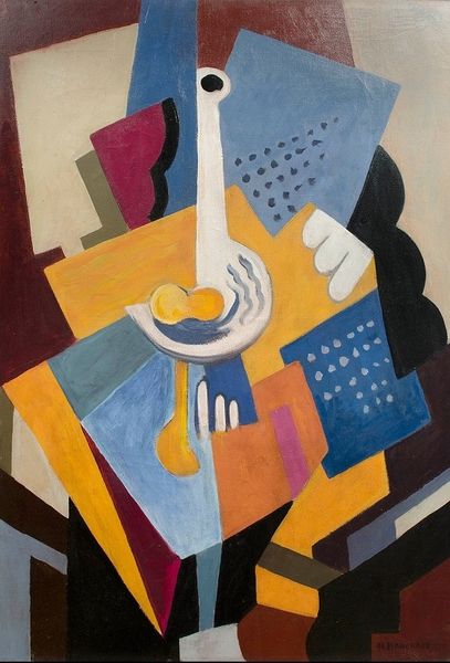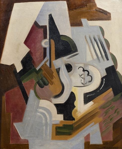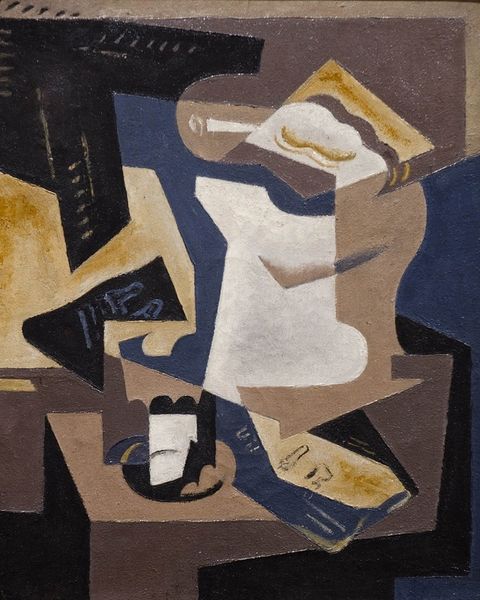 Curator: It feels grounded, almost architectural, despite the fractured perspective. Editor: We’re standing before "Cubist Composition/Still Life," an oil painting created in 1918 by María Blanchard. It's a strong example of her engagement with Cubism, exploring how geometric abstraction can deconstruct reality. Curator: Looking at the layering of forms and textures, one can imagine the careful preparation involved—each stroke, each calculated plane. The oil paint itself lends a weightiness that contrasts with the lightness typically associated with still lifes. What do you make of her material choices in this context? Editor: I'm particularly drawn to Blanchard's negotiation of gender within this modernist framework. Early 20th-century artistic circles were heavily male-dominated. Consider the power dynamics in place as a woman pushing the boundaries of representation amidst a revolutionary movement largely defined by her male peers. Blanchard was an active participant of that transformation. Curator: The textures, the specific kind of blues and browns used – are evocative of industry. It also begs the question how Blanchard might've utilized accessible, locally available resources while making art at this period, in contrast to some male counterparts, maybe? How did these things inform her final aesthetic, its perceived values and, ultimately, our consumption of this piece now? Editor: Right. She certainly confronted numerous socio-economic challenges in a war-torn Europe; ones undoubtedly reflected in the restrained palette and compositional frugality apparent throughout this painting. Art production in this setting was itself a radical act of defiance and determination. In our attempt to understand this composition we also begin to get at the story of her experience as a queer artist. Curator: It all comes down to materiality—Blanchard worked *with* oil paint, embracing a raw visual language that's very much indicative of modern practices, whereas maybe others treated paint differently, aspiring instead toward a traditional "illusion." And it also resonates at a bodily, visceral level, doesn’t it? We are compelled to think about how labor manifests in an abstract still life. Editor: Exactly, her commitment pushes back against prevailing constructs that attempted to restrict the potential of women at that time, creating space for a queer vision to emerge, even within abstraction. Thank you, this analysis sheds such necessary light on the nuances of Blanchard's powerful contribution. Curator: Agreed, seeing this Cubist composition, understanding it through this new lens, provides a whole new appreciation for its lasting relevance, no?