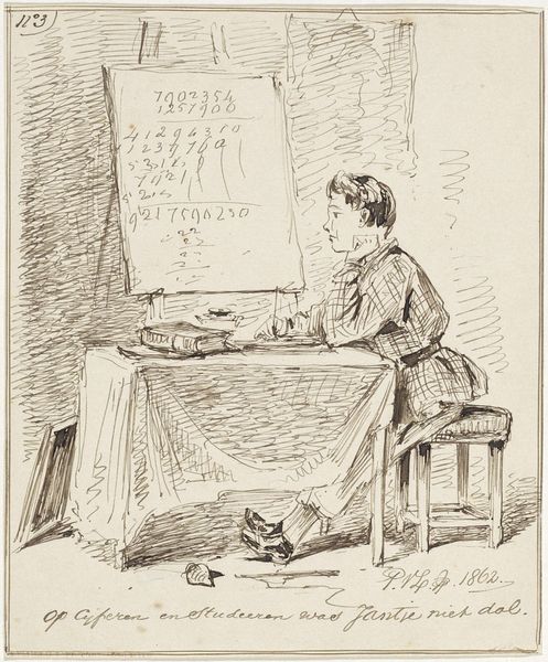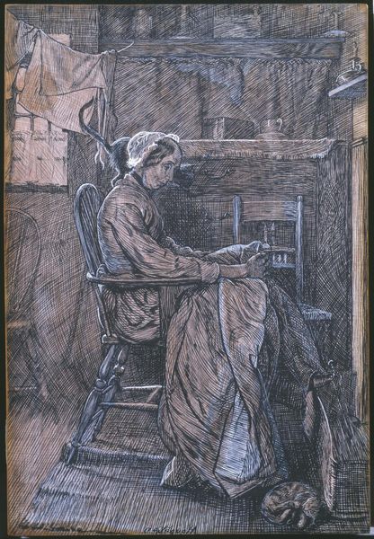 Editor: This is Archibald Standish Hartrick’s "Women’s Work: On Munitions - Skilled Work," from the Tate Collections. It depicts a woman working a machine. There's a real sense of quiet concentration here. What symbols stand out to you? Curator: Notice how the woman's gaze is directed not at us but intensely at her task. The machine itself becomes a potent symbol. During wartime, they symbolized both progress and destruction. The woman operating it bridges these concepts. What does her presence suggest to you in terms of cultural memory? Editor: I see a changing role for women, but also perhaps the grim necessity of war. It's a powerful and unsettling image. Curator: Precisely. Hartrick captures a moment where gender roles and societal expectations were reshaped by conflict, leaving a lasting imprint on our collective consciousness.