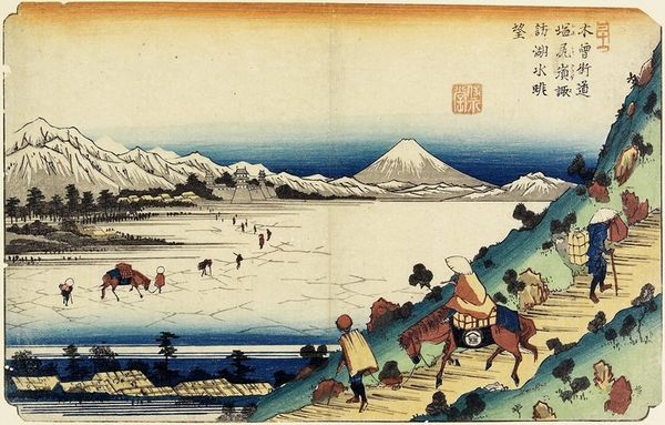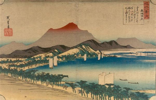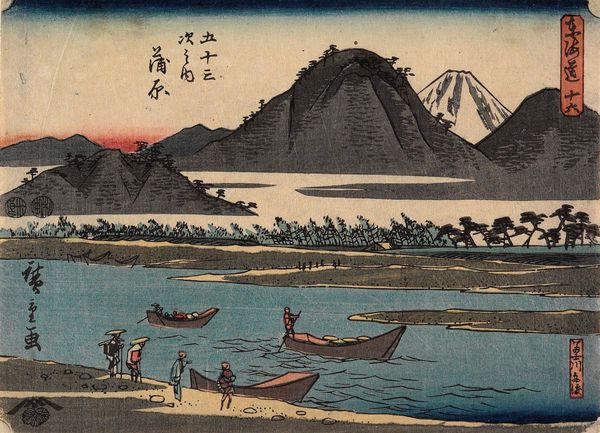 Editor: This is Utagawa Hiroshige's woodblock print, "No. 16, Kanbara: Ferry on the Fuji River," from the "Fifty-three Stations of the Tōkaidō" series. The river dominates the composition. How do you interpret the use of line and color to create depth in this print? Curator: Note the interplay of horizontal and diagonal lines. The horizon created by the far shore is intersected by the diagonal movement of the boats and figures, creating a layered effect. The restrained palette, predominantly blues and earth tones, reinforces the composition's planar structure. Editor: So, the color isn't about realism, but about defining space? Curator: Precisely. Hiroshige manipulates color to emphasize form rather than to mimic nature. It's about the structured arrangement, the interplay of line and color. Editor: Interesting! I hadn't considered the colors as structural elements before. Curator: Considering the arrangement of formal elements really opens the work up.