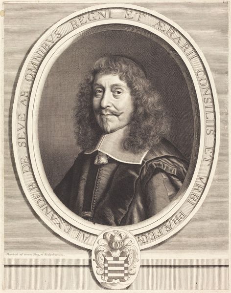 Curator: Here we have Robert Nanteuil’s 1652 engraving of Melchior de Gillier. The work resides here at the Metropolitan Museum of Art. Editor: It has an air of somberness, doesn’t it? The stark monochrome, the man's composed expression—it’s visually very controlled. A closed circle containing all the imagery only opens when a very rigid base completes it on the very bottom of the piece. Curator: Engravings like this were a crucial form of information dissemination in the 17th century. Nanteuil, celebrated for his skill, was essentially mass-producing images of important figures like de Gillier. The process itself—the labor of cutting those lines into a metal plate—speaks volumes about the effort involved in circulating these likenesses, almost a celebrity snapshot of the era. And note the text surrounding the figure itself! An open proclamation of service on behalf of the engraver towards their high born subject Editor: Precisely! It’s about structure as much as reproduction. Look at the precision in those lines, how they create form and shadow. The circular frame and ornate lettering provide a geometric counterpoint to the curves of his hair and robe. It's a very baroque composition—complex, but ultimately balanced, with an obvious interest on social structures within its layout, almost making the central figure subservient to a text, the contract, or in this case an address to "Sa Majesté" translated loosely to "His Majesty", as we can read at the top, encircling the whole visual! Curator: And consider the social context. De Gillier was "DHŌSTEL OR DE," as the frame tells us: likely a high-ranking state official under the king. This engraving served to broadcast his image and solidify his position within the social hierarchy. The material—the print—becomes a tool of power. Who knows the reasons why Nanteuil found himself having to craft it so beautifully and so masterfully for "natural 1652." as proclaimed by his signature. It's possible he was paid well for his labor... Editor: A tool, certainly, but also an aesthetic object in itself! Think about how the texture of the paper interacts with the ink, the light playing across the surface. Nanteuil has a clear understanding of visual rhetoric. Curator: A clear understanding shaped by patronage and the economic realities of his time. I keep returning to the sheer labor involved in creating something like this. It connects the artist to a whole network of workshops, suppliers, distributors... Editor: An important network, and it all funnels to what meets the eye today. Every line, tone, composition, all coming from a single choice: what is the message? and is it coming across? Curator: Absolutely, an eye catching display and a clear intent... A perfect testament to labor's place within our understanding of the artworks that survive it. Editor: Quite. And as always, the convergence of aesthetic intent and skilled production crafts such enduring objects!