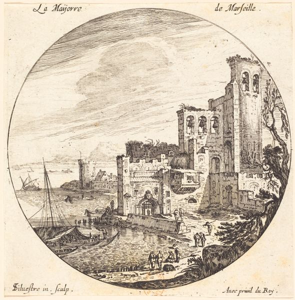 Lodovico Mattioli created this etching, titled "Plate 2: two figures outside of the walls of a town, a tower at center," during a period of significant social transformation. As European society was becoming increasingly urbanized, etchings like this captured a nostalgic look at the rural landscape. The print depicts figures outside the walls of a town dominated by a towering structure. Consider for a moment the implications of living inside or outside these walls. These barriers were not only physical but also social and economic. Those within enjoyed protection and status, while those outside often faced marginalization. The body language of the two figures suggests a narrative of exclusion, as they are confined outside the center of power. Mattioli’s work invites us to consider who is included and who is excluded from the perceived ideal of society. It serves as a poignant reflection on the enduring human experience of seeking belonging and recognition.