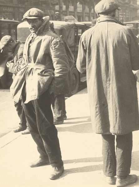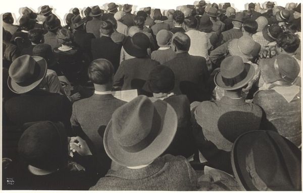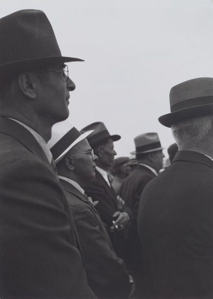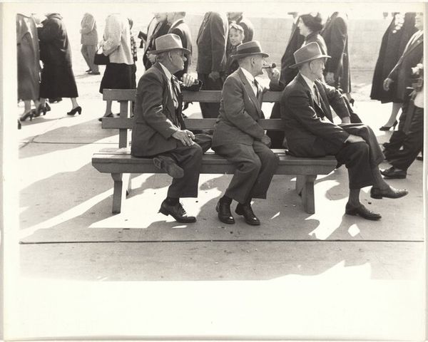 Curator: Robert Frank's photograph, "Men seen from behind--San Francisco," taken in 1956, offers us a glimpse into postwar American society. This print captures a group of men walking away from the viewer. Editor: Huh. The back view only makes me wonder about where they’re going, their thoughts. I see a kind of mid-century conformist energy, all these identically suited men. Like a school of sharply dressed fish. Curator: Exactly! The uniformity is key. We can understand this image as a critique of the era's emphasis on conformity, particularly regarding masculinity. Think of the social pressures of the time; the rigid gender roles and the expectation of men to adhere to a very specific professional and social script. Editor: They all seem swallowed by their suits, their individuality buried beneath the uniform. There's a loneliness to it too, strangely enough. Being part of the group but utterly anonymous. Like faceless drones following the crowd, all marching toward some unspoken end. I bet not one of them ever danced in the rain. Curator: Precisely. Frank's work often explores the undercurrents of alienation and unease beneath the surface of the American Dream. The choice to photograph them from behind is strategic, withholding their identities and forcing us to consider them as a collective. Their race, class—it becomes a commentary on the collective identity itself. Editor: It's oddly voyeuristic too. We're given this stolen moment, eavesdropping on the mundane, the everyday walk to... wherever. But maybe Robert Frank wasn't simply critiquing—perhaps there’s something deeper? Curator: What do you mean? Editor: Maybe a recognition, on some level. We're all walking away from something, aren't we? Facing an unknown future, often together, but fundamentally alone in that journey. These men are almost everyman and are a symbolic illustration of our individual journeys. Curator: That's a poignant way to frame it. Frank gives space to view the experience as social critique or as a symbol of shared humanity. It's really striking how much complexity and richness this seemingly simple image holds. Editor: Totally. Something about its plainness screams profound universal truths. Definitely gave me something to think about on my walk home.