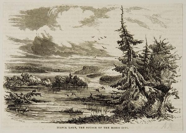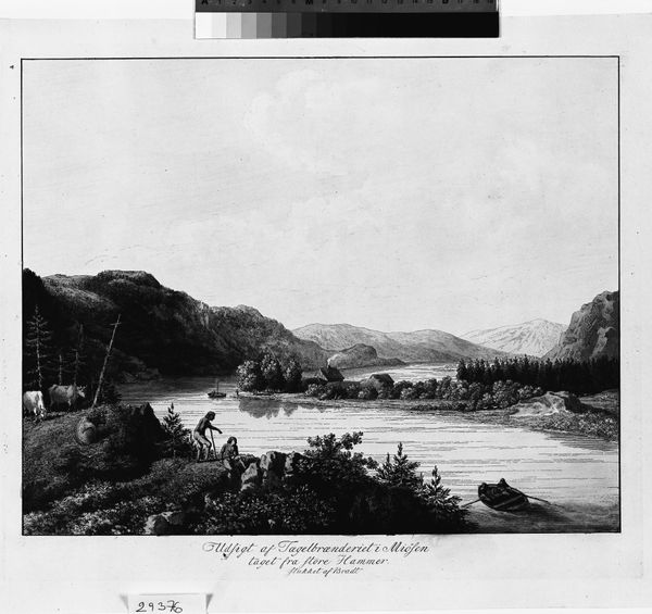Curator: Immediately, there's a compelling sense of nature's grandeur, a feeling of immersion and quiet power. The flowing water seems to speak volumes, doesn’t it? Editor: It does. We're looking at "Landscape at Bruflat in Valdres, Norway," created by J.C. Dahl in 1844. Dahl, known for his landscape paintings, captured this en plein air, as evidenced by the fresh spontaneity in the work. Curator: The water really anchors the image. Throughout history, rivers have represented time, change, the journey of life. Here, the rapid current suggests something unstoppable. There are a couple figures too, almost lost in the scenery – humans versus nature. Editor: Absolutely. See how the light falls? The composition guides our eyes: a rough foreground transitioning to a turbulent river with two men along the shores, beyond it all is a mass of vegetation until eventually, in the distance, one sees soft and quiet rolling hills under a vast clouded sky. It is classically Romantic, a calculated arrangement that maximizes drama and the sublime. Curator: Speaking of sublime, notice the mountains in the background? In Norse mythology, mountains were sacred places, homes to gods and spirits. In many cultures mountains symbolize ascension and spiritual insight, hinting at more profound truths. It speaks volumes about our ancestors' reverence for the land. Editor: Yes, but the materiality interests me. You know, its tactile nature. From the swift brushwork that renders the turbulent water to the delicate depiction of sunlight diffused across the mountainside, Dahl skillfully balances the solidity of forms with a feeling of lightness and evanescence, reflecting Romantic ideals but filtered through direct experience. Curator: I find myself considering the cultural memory imbued within a landscape like this, this place must have a deep history. You can imagine stories and experiences interwoven into every element of it: the river, trees, mountains... the painting seems to be a bridge to a forgotten past. Editor: Indeed, it serves to reveal Romanticism, not as a purely aesthetic category, but as an intellectual proposition made via canvas and paint. Thanks for unraveling some of the mystery here today!