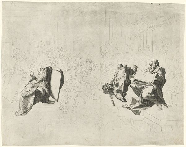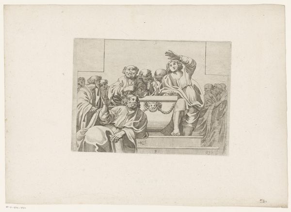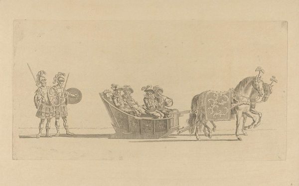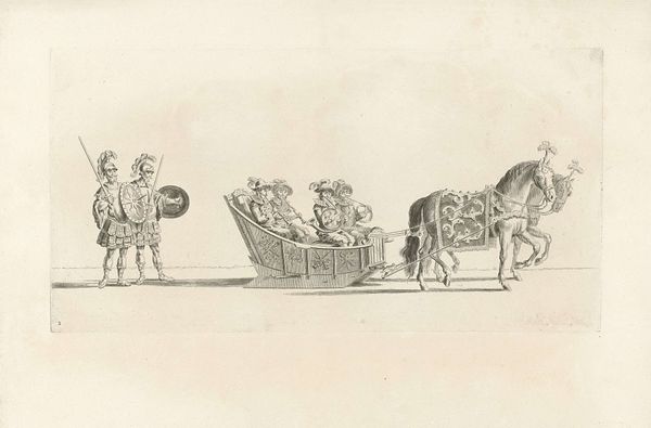 Nicolaas van der Worm created "Twaalfde slede" using pen in gray, presenting a festive winter scene. The composition is arranged horizontally, showcasing a procession led by horsemen, followed by a sled carrying musicians, all against a pale backdrop. The materiality of the drawing, rendered in delicate gray lines, imbues the scene with a sense of elegance and refinement. The formal structure of the artwork reveals a precise organization. The linear quality of the pen strokes defines the forms of the horses, figures, and sled, delineating their shapes and volumes with clarity. Van der Worm masterfully employs line to create texture and detail, from the intricate patterns on the sled to the flowing manes of the horses. Semiotic analysis reveals the cultural codes embedded within the artwork. The sled, an ornate vehicle, symbolizes status and luxury. The combination of riders, musicians and detailed ornaments point to a carefully constructed display of wealth and festivity. This is a demonstration of status through cultural symbols.