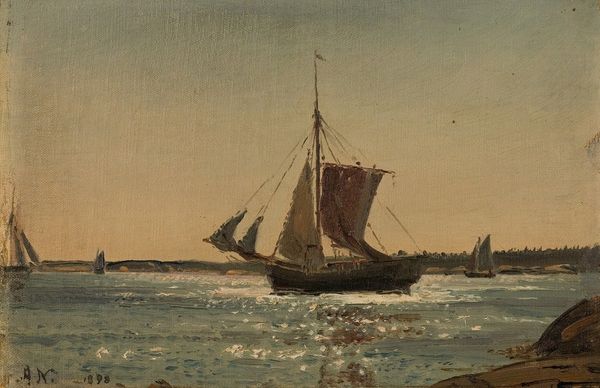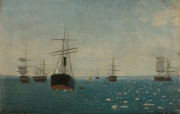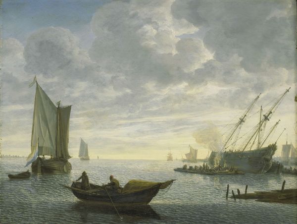 Curator: Emanuel Larsen, a Danish painter, captured this scene, "A Ship of the Line at Anchor" in 1847 using oil paint. What's your first take on this work? Editor: Serene. Almost too serene, considering the ship's presence. There's a stillness that borders on melancholic. Curator: Indeed. Consider the context; ships of the line represented Denmark's naval power, and here, it is still, anchored, almost humbled by the vastness of the sea and sky. The painting seems to whisper of a transition, perhaps from naval dominance to a more peaceful era. Editor: Visually, the anchored ship almost appears subordinate to the pier with people standing on it; figures that now take precedence over a symbol of power. There are strong symbolic undercurrents—the pier is active, vital with the figures facing forward; a strong, active community while a massive vessel sits idle, the past receding. Even the small skiff points from the boat towards the people on the pier. Curator: A telling juxtaposition, very true. Notice also how the artist uses light. It's diffused, soft, lending an air of nostalgia. The realism of the water suggests an immediacy while the lighting washes away an sense of a specific place. Editor: And observe the color choices—muted blues and grays, reinforcing that subdued emotional tone. The painting conveys a sense of observation. The silhouettes on the pier evoke the figures that Caspar David Friedrich so wonderfully captures in his Rückenfigur paintings. There is almost an allegory present—with these human figures standing, witnessing a great event; they become almost mythical themselves in bearing witness to this moment of historical transition. Curator: An interesting point of view that is quite possibly informed by Denmark's political situation. Remember, 1847 was a time of rising nationalism and calls for liberal reforms, subtly hinted at in Larsen's work by emphasizing community and the common man over a symbol of military might. This tension may echo a broader societal shift in values. Editor: So, the ship of the line—historically a symbol of national strength—becomes refigured as a marker of cultural change through pictorial strategies. The imagery shifts the emotional register from outward naval force to quiet introspection about national and cultural identity. A beautiful shift. Curator: It adds depth to what initially appears to be a simple seascape. A thoughtful observation. Editor: The longer you look at it, the more questions it asks. It's as if Larsen isn't merely painting a scene, but also posing a question.