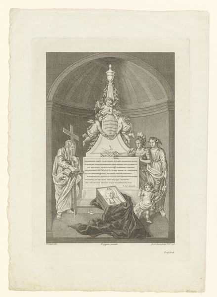 Editor: This engraving from 1794 is titled *Allegorical Monument to Hendrik Danielsz. Hooft*. It’s attributed to an anonymous artist. The imagery is really striking, quite solemn. The central figure seems to be lying in state. How do you interpret this work? Curator: Well, beyond the surface solemnity, it’s crucial to understand this print within its late 18th-century context. It reflects not only personal grief, but also larger societal anxieties surrounding death, power, and legacy, doesn’t it? Neoclassicism was in full swing, and with it, came an engagement with civic virtue. Consider the era – revolution brewing in France, social upheavals shaking established norms. How might this commemoration also function as a carefully constructed narrative of a man's life, meant to solidify his family's status amid shifting political sands? Editor: I hadn't considered that aspect of it! It makes sense given the deliberate poses of the mourning family members in the foreground and the idealized monument above. Almost like a stage. Curator: Exactly! Think of the body as political in itself. What choices are made in his presentation? His relationship with the mourning family and community tells a bigger tale of identity, class, and political ideology in that time. What sort of questions does it raise about how individuals and society grapple with issues of power and mortality? Editor: I guess I was initially focused on the individual loss, but seeing it as a statement about legacy changes the meaning. The engraving then becomes a carefully worded political narrative. Thanks so much for helping me think about this print through that lens! Curator: My pleasure! Always consider the power dynamics and ideological frameworks in every image, and ask yourself, who is this *for*?