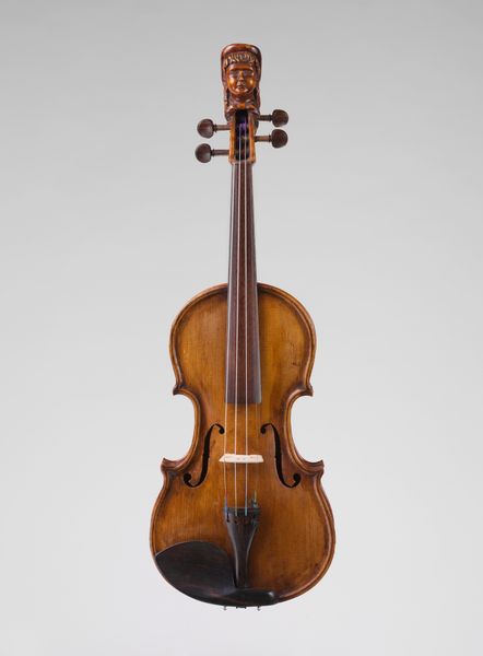 Editor: Here we have Charles Francis Albert’s “Mute Violin,” a wooden sculpture from between 1876 and 1896. What strikes me first is its, well, unusual shape! It's almost cartoonish. It’s intriguing, but I wonder what inspired such a design. How do you interpret this work? Art Historian: The form immediately suggests a subversion of expectation, doesn't it? It speaks to the deeply embedded symbolism of the violin itself. Think of what the violin traditionally represents: passion, skill, artistic expression. Now consider this "Mute Violin." What does muting that passionate voice signify in the context of late 19th-century academic art? Is it a commentary on artistic restraint, or perhaps the silencing of creative voices within rigid structures? Editor: That’s interesting! The silencing part especially resonates with me. Do you think it's more about suppressing individuality? Art Historian: It could certainly be read that way. Look at the abstracted, almost grotesque form of the instrument itself. The conventional, elegant curves are exaggerated into these bulbous shapes, which arguably diminish the instrument’s implied voice. Given that the violin is traditionally associated with solo performance, does this grotesque modification imply a broader commentary about artistic autonomy, maybe the individual's struggle against conformity? Editor: I didn't even consider it that deeply, but what you said about the "silencing of the individual" makes me reflect on the societal constraints that artists probably faced then, and, really, maybe even still. It is food for thought! Art Historian: Indeed. The symbolic potential is quite rich, demonstrating how objects, when transformed into art, can reflect cultural anxieties and evolving identities. Always consider: what symbols were being dismantled, challenged, or reinvented when this work was created? It shifts your view. Editor: I will certainly remember that perspective going forward. Thanks for illuminating that, it gives me a much richer understanding!