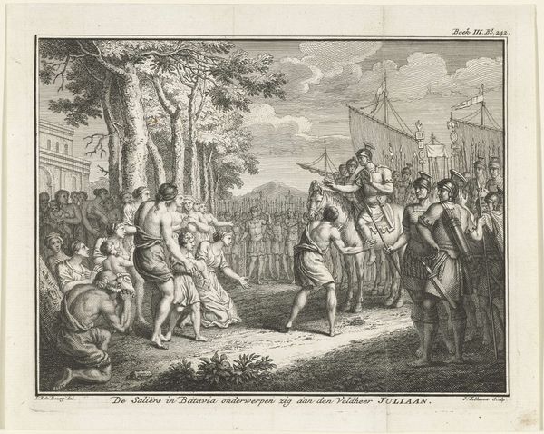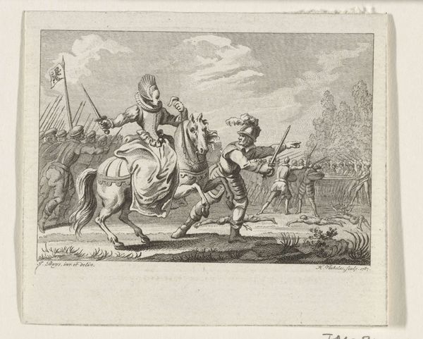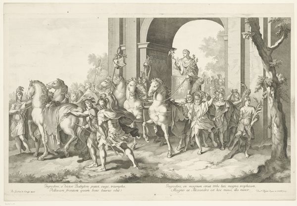 Editor: This is "Hendrik IV van Frankrijk te paard die de onderwerping van de Parijzenaars aanvaardt", a 1757 engraving by Noël Le Mire, held at the Rijksmuseum. The level of detail is really striking. It almost feels like a photograph, despite being made using such laborious printing processes. What should we be looking at here? Curator: I think it is important to acknowledge that what we see in the final print is a highly mediated version of history. Le Mire wasn’t present at this event, he wasn’t making sketches from life, but translating a representation into another medium. How do you think that affects the meaning of the image? Editor: I guess that the layers of production involved would add another layer of... propaganda? Curator: Precisely! This print wasn't about capturing a "truthful" moment, but about creating and disseminating a very specific narrative of royal authority. Consider the sheer labor invested – the engraver's skill, the materials used, the printing process itself. All that effort reinforces the idea of the King’s dominance. Think, also, of its potential use. Was it commissioned? Who bought it, and why? Editor: Good point. So the materials and the means of production contribute to the artwork's cultural value? I guess prints like this were more affordable and were aimed at the popular classes of the day. Curator: Exactly. This makes them radically different than large-scale oil paintings, typically accessed only by the wealthy elite. And by circulating this image widely, Le Mire and his publishers participated in constructing a particular public memory of Henri IV, impacting perceptions of kingship itself. Editor: That's fascinating. I'll never look at historical prints the same way again. Curator: That is the point of truly looking; you discover a whole other universe hidden in plain sight.