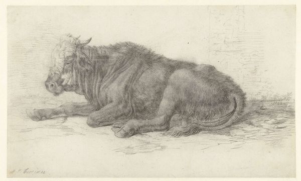 Curator: It’s funny how the simplest drawings can sometimes say the most. This is "Liggende kat, naar rechts"—or "Lying Cat, to the Right"—by Guillaume Anne van der Brugghen, probably done sometime between 1821 and 1891. Editor: It looks so…furtive, doesn't it? Like a quick glimpse caught of a feline fugitive. The way the pencil is scratched into the paper gives it a nervous energy. Curator: I think "furtive" is a good word for it. This piece most likely came from a personal sketchbook; it has the air of being sketched in a moment, on the fly. It's immediacy. Editor: Right, a captured moment. I see that the sketch's value is in capturing the "first draft" of thought more so than in technique itself. I like the contrast of materials used – rough paper against delicate, intentional marks left behind with a pencil. It makes me think about the artist’s physical labor of producing the piece; their hand, the pencil, the movement. I imagine he must have also had other work going at the same time. Curator: Yes, and probably loved the quick shift from serious studio work to these small, delightful studies. It feels very intimate somehow, peeking into the artist's private observations. I love that about sketchbooks; it feels like rifling through someone’s very soul, if that doesn't sound too grand! Editor: Not at all. To me, sketchbooks like this represent a direct intersection between an artist’s labour, daily life, and materials available. How the means of creation and consumption influence our perspectives is such an appealing conversation within the art world. Curator: Exactly. The materials tell a story on their own. Editor: Well, that definitely gives me some extra ideas to consider when I'm next sketching from life – the labor of observing! Curator: And for me, a reminder to keep my eyes open to beauty in the briefest of moments.