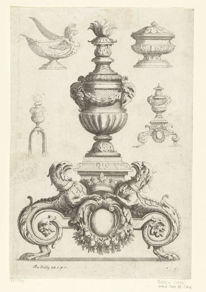 Editor: This is "Urn met deksel," an engraving by Georges Tournier from around 1650, housed in the Rijksmuseum. It depicts a baroque urn with a lid, incredibly detailed, but almost austere. How should we read this level of formality in rendering such a utilitarian object? Curator: It's fascinating to consider the implied politics within this domestic scene. Engravings like these were circulated amongst elite classes. Note the architectural elements of the urn – the almost masculine handles and the weighty lid – suggesting power, authority, even ownership of space and resources. What ideologies might be embedded in its design and function? Editor: So, more than just decorative, it becomes a symbol of the owner’s position within society? The almost militaristic form does have that "command and control" presence. Curator: Exactly! Consider, too, the Baroque style; its excess wasn’t simply about beauty, but also a demonstration of wealth, influence, and a very particular aesthetic taste. Are there other examples of artwork where utility marries a message? How do you see this reflected in, say, contemporary design and architecture? Editor: I think it challenges this idea that decorative arts are inherently less significant or somehow separate from displays of power. The engraving provides another avenue for considering the intersection of gender, class, and aesthetics. Curator: Precisely. This detailed depiction prompts us to investigate the less obvious ways objects participate in creating, confirming and sometimes resisting socio-economic and political power structures. It shows art having implications in more ways than expected. Editor: This engraving of an urn really expands the understanding of how everyday objects participate in creating our realities! Thank you for the insightful historical context and discussion, it has widened the lens on interpreting "decorative" art.