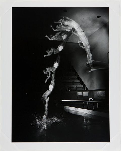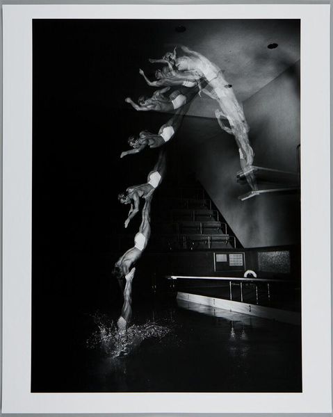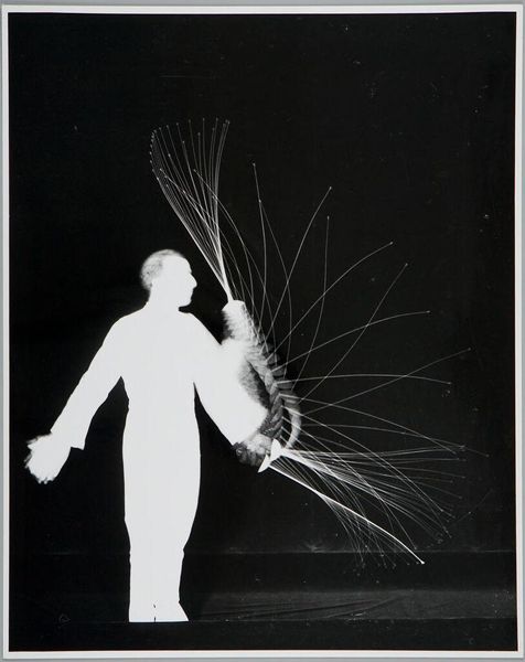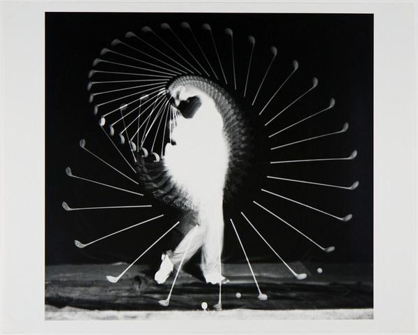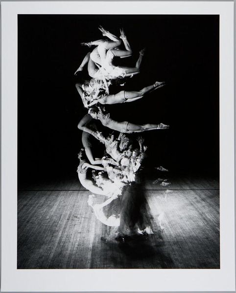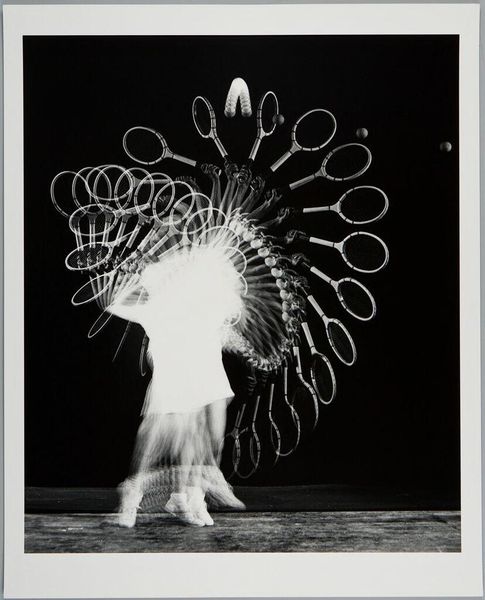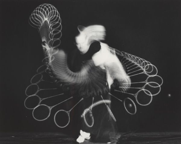Curator: Here we have Harold Edgerton’s "Foil Trick," a captivating black and white photograph currently housed at the Harvard Art Museums. Editor: Ooh, my first thought is of a ghostly figure, almost like a blurred spirit dancing in the dark. It's kind of haunting but graceful. Curator: Edgerton was a pioneer in stroboscopic photography. What looks ghostly is actually a series of movements captured in rapid succession, all layered within a single frame. Editor: So it's about deconstructing a single moment, breaking it into these ephemeral slices of time. Like a visual echo? Curator: Precisely. Consider the socio-historical context: this image emerges from a period deeply engaged with advancements in science and technology, reflecting a desire to capture and understand fleeting phenomena. Editor: I love how science and art can collide, blurring the lines between objective observation and subjective interpretation. It makes you think about how we perceive movement, and the limitations of our own eyes. Curator: And it also raises questions about representation – how do we capture the essence of a performance, the lived experience of the dancer? Editor: It’s as if Edgerton found a way to paint with light and time. I walked in thinking 'ghost,' now I’m seeing the elegant math of motion. Curator: Indeed, it offers a unique perspective on the body, movement, and the passage of time, framed within the context of technological innovation.