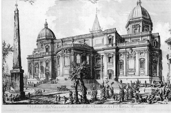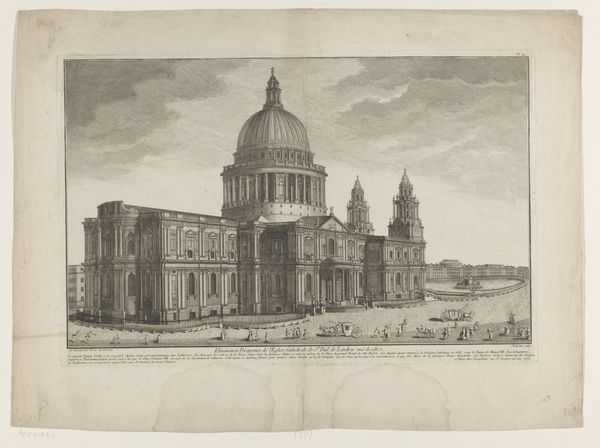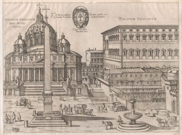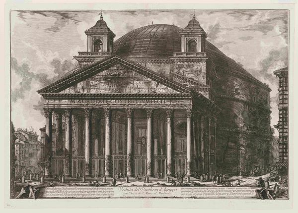 Editor: Here we have Piranesi’s etching, "View of the rear entrance of the Basilica of S. Maria Maggiore, from Veduta di Roma," created sometime between 1737 and 1747. The detail is just incredible. All those tiny figures… it gives a sense of the everyday bustle against the grandeur of the basilica. What do you see in this work? Curator: For me, the interest lies in understanding this print not just as a representation, but as a *product* of eighteenth-century Rome. Look at the sheer labor involved in creating this etching; the multiple states it likely went through. We can imagine the workshop, the artisans involved, the networks required to distribute it. Editor: So, you're saying it's more than just an image, it’s an artifact of a particular economic and social system? Curator: Exactly. And consider the intended audience: likely wealthy tourists, buying these prints as souvenirs. This piece is itself a commodity, feeding into a burgeoning tourist industry and reinforcing certain power dynamics between the viewers and those depicted within the cityscape. The architecture and the etched image of the architecture served their purpose, no? Editor: That's a perspective I hadn’t considered. So the value isn’t solely in the artistic skill but in its role within this system of production and consumption? Curator: Precisely! It asks us to think about art’s purpose, not just its aesthetic qualities. Whose Rome is being represented, and for whom? Editor: This gives me a completely new framework for interpreting historical prints! It reveals hidden labor aspects! Curator: Indeed. By examining the material conditions and social context of its production, we gain a much richer understanding of both the artwork and the society that produced it.