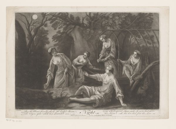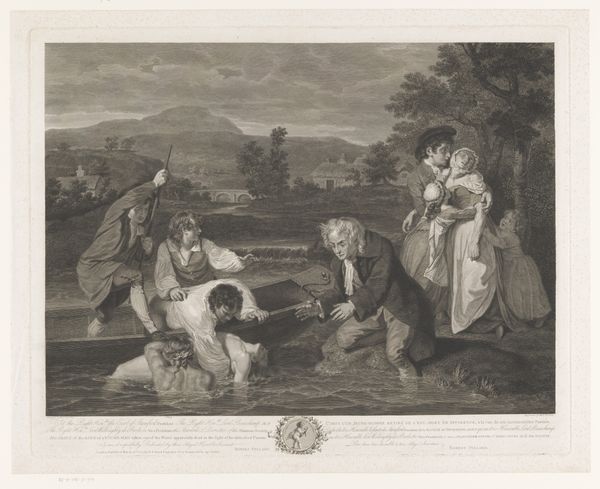 Jozef Karel De Meulemeester created this print, "Mozes wordt gevonden in de biezen mand in het water," using engraving techniques. The fine lines and careful cross-hatching, all achieved through skillful manipulation of burins and other tools, create a range of tonal values. Note the precise rendering of textures, from the rippling water to the delicate drapery of the figures' gowns, all brought to life through the labor-intensive process of engraving. Prints like this one were an essential medium for disseminating images and ideas in the 18th and 19th centuries, offering a relatively affordable way to reproduce and share artworks with a broader audience. The skill and time required to create such a detailed engraving speaks to the value placed on craftsmanship in this period. Yet, the print also represents a shift towards mass production and consumption, foreshadowing the industrialization of art. Recognizing the artistry involved in its production allows us to understand more deeply the social and cultural significance of this print, beyond its subject matter.