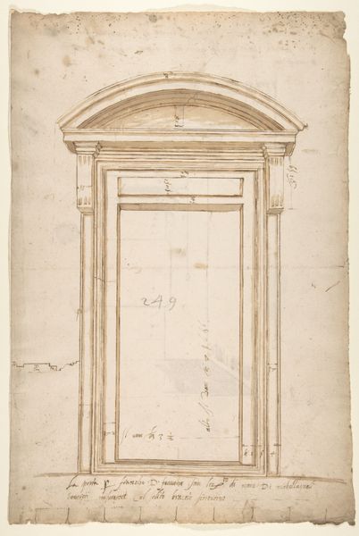 Curator: Ah, here's a fascinating drawing from the Metropolitan Museum’s collection, created sometime between 1500 and 1560 by an anonymous artist. It's a portal design for Sant’Apollonia, rendered in ink on paper. We see both an elevation and a plan. Editor: It feels so... contained. Minimal, even. All these meticulous lines creating this very stoic facade. The ink wash gives it a ghostly feel, like peering into a half-remembered dream of perfect order. Curator: Precisely! Architectural drawings from this period weren't just technical exercises. They were declarations of civic and religious ideals, shaped by Renaissance humanism and the rediscovery of classical forms. Think about how the Church used architecture to project power, wealth, and divine authority. Editor: Right. It’s interesting how blank the center is. Is that intentional, a space for, like, divine inspiration or an emptiness ready to be filled? What *would* go there in reality? Curator: That void might suggest a niche for a sculpture or perhaps a dedication inscription. These portals served as liminal spaces—thresholds—between the secular world and the sacred interior. They weren't merely entrances, but rather carefully designed transitions that shaped the worshipper's experience. The anonymity, though, tells us it's a workshop design, perhaps one of many possibilities considered. Editor: You're making me see beyond just lines on paper! Thinking about it that way—as a gateway between worlds—changes my entire perception. The slightly off-kilter, handmade quality feels incredibly personal. It hints at a human creator behind all this measured precision. Almost fallible, in a charming way. Curator: Absolutely. The act of drawing itself becomes a testament to the ambition of the Renaissance and, well, to us, now as people investigating its social life, how art has impacted humanity. It reflects their aspirations to rebuild and redefine their world through the lens of classical learning and Christian faith. Editor: Thinking about someone drafting this five centuries ago and us observing today from New York city... The drawing now holds the space for those temporal shifts in an ineffable state. It contains time! Thank you, portal design of Sant'Apollonia.