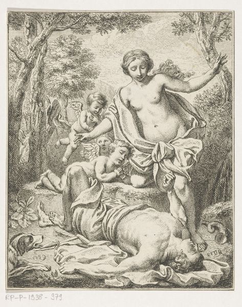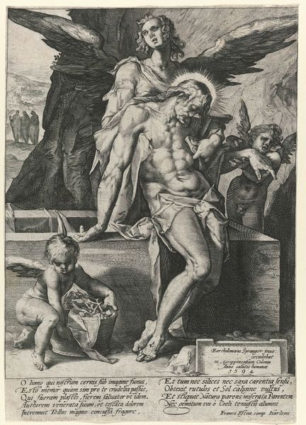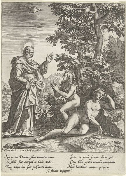 Editor: This is "Diana's Nymphs Discovering the Pregnancy of Callisto," an engraving by Jacob Matham from around 1590. It has such a formal, posed feeling about it, almost like a stage play frozen in a single moment. What do you see in this piece, beyond the surface narrative? Curator: Well, first, consider the visual vocabulary at play. Notice how Matham utilizes the classical theme to explore societal anxieties. Pregnancy outside of marriage, especially for a follower of Diana, the goddess of chastity, would have carried significant cultural weight. The revealed pregnancy serves as a symbol, really a disruption, of the idealized order represented by Diana and her nymphs. Editor: So it's not just a story, it's a representation of social tension? Curator: Exactly. The figure of Callisto is pivotal. Is she ashamed? Is she defiant? It is unclear, because there are diverse opinions about Callisto on the engraving, reflecting the spectrum of responses one might expect within that social context. And look how the figures pointing to Callisto are themselves framed: are they indicators of judgment, fear, condemnation or are they a visual instruction meant for a diverse public, each figure on that end is very unique, just like a varied audience. Consider also the fleeing figures in the background. What narrative thread do they reveal to us? Editor: They look like they’re escaping the scene. Is that supposed to represent some form of social stigma or something of that nature? Curator: It certainly implies the consequences of Callisto's transgression. What this engraving really signifies is how art and symbol shape communal morality, reminding us that these visual motifs live far beyond the boundaries of "ancient" myths; these very same discussions reverberate in contemporary issues about societal boundaries, individual freedom, and acceptance. Editor: I never considered it like that before; how cultural anxieties and memory work like a stage play over centuries, fascinating! Curator: Indeed. Art enables those silent but profound conversations, sometimes without anyone noticing at first.