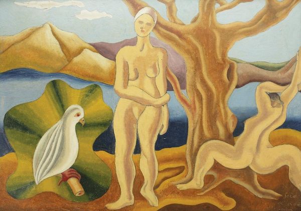 Eugeniusz Zak painted this scene, devoid of specific date, depicting a couple in a serene landscape. Observe the woman's raised arms; this gesture, reminiscent of classical depictions of nymphs or goddesses, carries echoes of ritualistic cleansing or an offering to nature. This motif is deeply embedded in our cultural memory, reappearing across centuries in various forms, from ancient Greek sculptures to Renaissance paintings. Think of Botticelli's Venus, emerging from the sea, hands similarly posed, embodying ideals of beauty and purity. Here, Zak subtly reinvents this archetypal image. Consider how such gestures tap into our subconscious, evoking primal emotions and desires. The act of raising arms, whether in supplication or liberation, engages viewers on a profound level, triggering a sense of awe and connection to something larger than oneself. The symbol has continued its journey, adapting, transforming, and resurfacing across time.