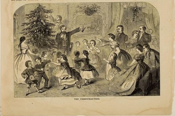 Curator: Right, let’s dive into this bustling scene. What we have here is "Uncle John with the Young Folk: ‘All Prizes and No Blanks!’" It's an engraving by the Dalziel Brothers after Arthur Boyd Houghton. Editor: It's wonderfully chaotic! A dizzying vortex of crinolines, faces, and light. There’s a kind of frenetic energy to the piece. Curator: Absolutely. Look at the Christmas tree positively glittering, a focal point in this domestic revelry. Houghton captures the Victorian obsession with Christmas festivities. Note the title, "All Prizes and No Blanks," hinting at the games and fortunes being shared. It taps into a cultural moment, really. Editor: Mmm, games of chance and festivity, yes, but there’s something more, a sense of childhood innocence being both celebrated and, subtly, observed, even judged. The faces in the background seem to comment on the innocence of the foreground. Curator: Interesting. Perhaps Houghton is subtly critiquing the excesses of Victorian society through this image of supposed innocent joy? Editor: Maybe. All that bright fabric and the dark underbelly of what is proper. It's a lot to unravel. Curator: A fascinating blend of light and shadow, both literally and figuratively, then. Editor: Precisely. Definitely makes you think, doesn't it?