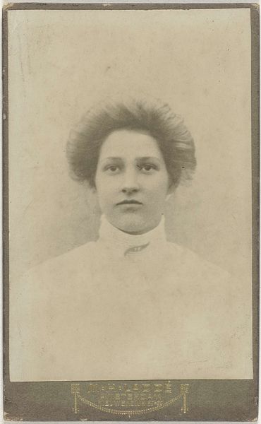 Editor: Here we have "Portret van (vermoedelijk) een Surinaamse vrouw aangeduid als Marie", a photograph by Eugen Klein, circa 1890-1915. There is a certain stillness to it, a sense of quiet dignity conveyed through a formal composition and the subject's direct gaze. How do you interpret this work through the lens of formal qualities? Curator: Notice first the oval frame, a classic choice for portraiture of the era, softening the geometric lines of the photograph itself. Klein plays with light and shadow, particularly evident on her face. Observe the subtle gradation creating depth and highlighting her features, almost like a chiaroscuro effect used in painting. It's an interesting play between the supposed objectivity of photography and the aesthetic considerations typically reserved for painting. Editor: So, the manipulation of light becomes a key element? Curator: Precisely. Consider the tonality – the muted sepia tones imbue the photograph with a timeless quality. The subject's clothing, though indistinct, adds to the overall composition. Can you see how the high collar creates a framing effect for the head and neck? It directs our gaze upwards. Editor: Yes, I see what you mean. The focus seems to be directed straight at her gaze, which creates the stillness. Is there anything significant about her posture? Curator: Note how the head is tilted slightly, yet her gaze remains level. It adds a dynamism that contradicts the still pose and infuses it with life, yet it retains symmetry and control in her personal composure. What do you think? Editor: It’s like a paradox. Formality meets subtle dynamism. Thanks to you, it's easier to appreciate how the form drives the meaning of the work. Curator: It shows the expressive potential embedded in photography by paying careful attention to light, composition, and balance. An excellent conversation; thank you for your perspicacity!