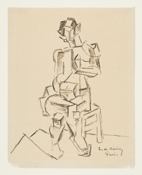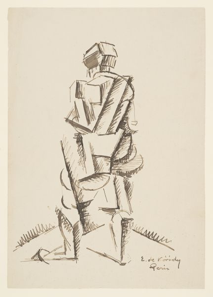 Editor: This is Elemér de Kórödy's "Standing Figure," created in 1913 with pencil. The fragmented shapes and sharp angles definitely give off a Cubist vibe, but something about the soft shading keeps it from feeling too harsh. How would you analyze this piece from a formalist point of view? Curator: We can begin by considering the inherent structure. The artist’s fracturing of the human figure into geometric forms immediately challenges our perception of form. Note the strategic use of shading: it is not used to create depth, but rather to highlight certain planes and obscure others, furthering the fragmentation. How does this manipulation of light affect your understanding of the subject? Editor: I see how the shading contributes to the disjointed effect. Instead of suggesting roundness or volume, it just emphasizes the flat, intersecting planes. So, you're saying that the subject is almost secondary to the formal arrangement? Curator: Precisely. While we can identify it as a "Standing Figure," Kórödy is fundamentally exploring the relationships between lines, shapes, and tones. Observe how the angularity echoes throughout the composition, creating a sense of dynamic tension. Consider the visual effect achieved by the repetition and variation of these fragmented forms. Editor: The repetition really creates a sense of movement even though it is a static figure. The lines pull your eyes in different directions across the surface of the work. It's amazing how much can be communicated just through line and form. I think I appreciate Cubism a lot more now! Curator: And that appreciation comes from engaging with the internal logic of the artwork, isolating the forms from conventional external context, as well as noting how the internal composition has a significant impact on visual movement.