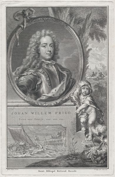 Editor: Here we have Jacobus Houbraken’s portrait of Gerard van Loon. I notice there’s a lot of classical imagery like the laurel wreath and the cherub, but it’s juxtaposed with the books and coins. What do you see in this piece? Curator: The juxtaposition you noticed is key. How might we interpret this portrait within the context of 18th-century Dutch society, where commerce and intellectual pursuits were intertwined, yet excluded many? Editor: So, the portrait isn’t just about van Loon as an individual, but about the values of his time? Curator: Precisely. It prompts us to consider who is represented and who is not in narratives of Dutch success. Perhaps understanding the power dynamics at play during that era. Editor: That’s given me a lot to think about in terms of representation. Curator: Indeed. It's a reminder that art can be a powerful tool for both reflecting and questioning the status quo.