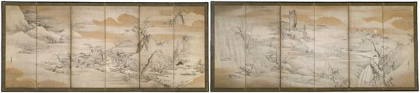 Editor: So, here we have Tenshō Shūbun’s “Landscapes of Autumn and Winter” from the 17th century. They’re ink and tempera on what looks like paper, and something about their simple, almost stark, composition is really drawing me in. How do you interpret this work? Curator: Well, looking at the means of production, the stark ink and tempera are deceiving. Paper itself held value; the act of painting with precious materials signified not only status but also, more importantly, a relationship to the natural resources from which the artwork was crafted. How might that materiality, in turn, frame our perception of the "landscapes" here? Editor: I see what you mean! It wasn’t just about depicting scenery, but engaging with the materials harvested from that same world. Did the support—the paper—influence Shūbun's technique at all? Curator: Absolutely. The absorbency of the paper would necessitate a deliberate, perhaps even economical, application of ink. Each brushstroke holds weight because of the material limitations, so you can’t have excess or needless flourishes here. Also, think about who had access to the training to master brushwork that respected materials in this way, or who controlled that production of materials like the paper, ink, and pigments! Editor: That's fascinating! I never thought about the skill being linked so directly to the inherent properties, and the cost of the medium. Now I understand more that what appear at first sight to be merely nature depictions were indeed infused with labor and social connotations that resonate even today! Curator: Exactly! And this deeper understanding gives new context for seeing that there were probably ways people valued and exchanged nature, skill, and art throughout history.