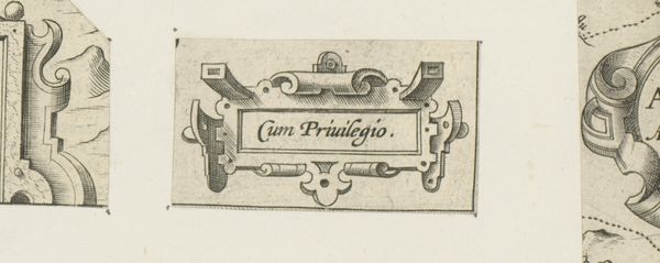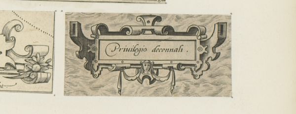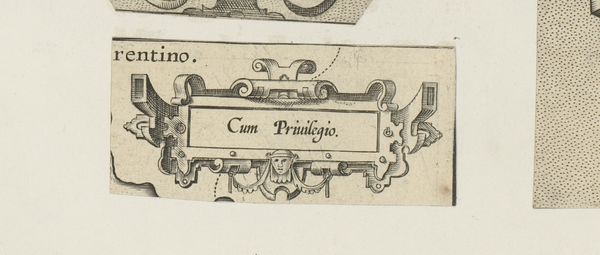 This is an engraving of a small cartouche with a mask and two butterflies, made by an anonymous artist. The cartouche, rendered in precise lines, presents a study in contrasts. Its rectangular frame, inscribed with the words "Cum Privilegio," is softened by ornamental flourishes. Note the symmetrical arrangement of elements, with a mask-like face at the top. This symmetrical structure provides a sense of order. The choice of ornamentation, including the butterflies, introduces a layer of complexity. Butterflies are traditionally symbols of transformation and freedom. This visual language allows for the piece to engage with ideas such as privilege, transformation, and the boundaries between nature and culture. In essence, this small cartouche operates within a structural framework, yet its symbolic details resist a singular, fixed interpretation. It encourages us to consider the interplay between formal constraints and symbolic expression.