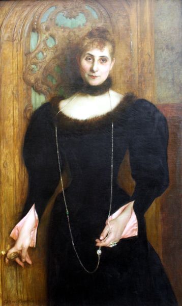Curator: Editor: This is Gustav Klimt’s 1901 oil on canvas, “Portrait of Rose von Rosthorn-Friedmann,” currently housed at the Belvedere in Vienna. I’m immediately struck by the stark contrast between the rich black dress and the vibrant blue backdrop. What do you make of this piece? Curator: Well, beyond its visual appeal, I see a portrait steeped in the societal tensions of early 20th century Vienna. Klimt, aligned with the Vienna Secession, challenged the conservative art establishment. What's your understanding of the subject's position within this cultural moment? Do you read anything in her pose? Editor: It seems like a conscious attempt to break from tradition. It's interesting you mention her position; I hadn't really considered that beyond a compositional element, the gaze is also pointed outside. But considering Klimt’s affiliation with the Secession, perhaps the choice of subject speaks volumes. Was she associated with the avant-garde? Curator: Rose von Rosthorn-Friedmann came from a wealthy, intellectual, and, importantly, Jewish family. Patronage was a key battleground for the Secession. Klimt's portraits allowed wealthy patrons a chance to assert progressive cultural identity, subtly pushing back against growing antisemitism and traditional hierarchies. How does knowing this change your interpretation? Editor: That context gives it a whole new layer of meaning! It's no longer just a portrait; it's a statement, a quiet act of defiance through art. And it places her within the fight for emancipation of thought that Klimt and other artists were spearheading in the Viennese Secession. It gives the image much more agency than it would at first suggest. Curator: Exactly! Art rarely exists in a vacuum, and by understanding its historical and social context, we can unlock so much more of its meaning. I appreciate how you took on board those themes from this painting and considered them as political statements. Editor: Absolutely! I will surely be thinking about art in the broader context in which it was made. It changes everything!