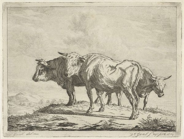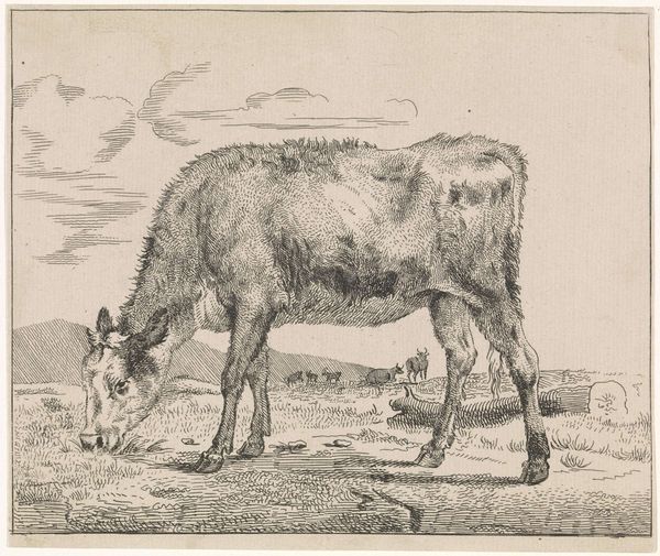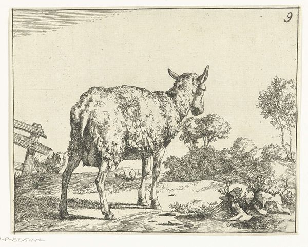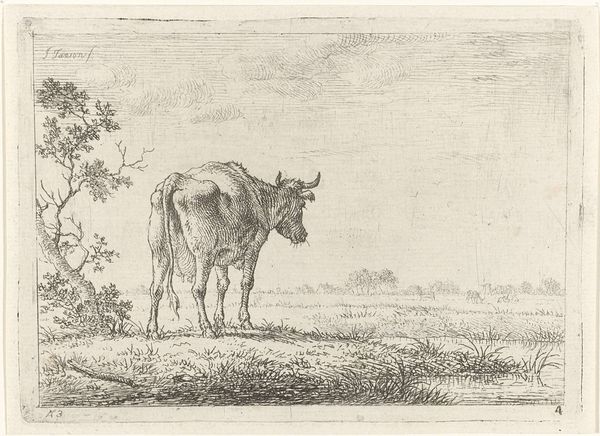 Editor: Here we have Johannes Janson's "Standing Cow," an etching from around 1761-1784. It feels like a very direct representation of rural life; the texture of the cow's fur is so detailed. What strikes you most about this piece? Curator: It's fascinating how Janson utilizes the etching technique to depict not just the cow, but also the landscape's raw materiality. Notice the marks that render the foliage—consider the tools, the acid, the very labor invested in creating this seemingly simple scene. How does this elevate the subject, the cow, within the social fabric? Editor: I hadn’t really considered the amount of work needed to produce an image like this! So you're saying that it speaks to the role of the cow, perhaps livestock in general, as a core element in 18th century rural life, elevated by the medium used to represent it? Curator: Precisely! Consider also the distribution of prints in that era. How might this image of a commonplace animal find its way into urban spaces, entering new dialogues surrounding food production, the agrarian economy, and even class distinctions? How does it function as a commodity in itself? Editor: So, even a simple image of a cow can reveal deeper societal structures and the ways in which art functioned within them. I will certainly think differently about art mediums going forward! Curator: Indeed! This reminds us that art isn't just about aesthetics, but about understanding its connection to labor, materials, and consumption patterns shaping social realities.