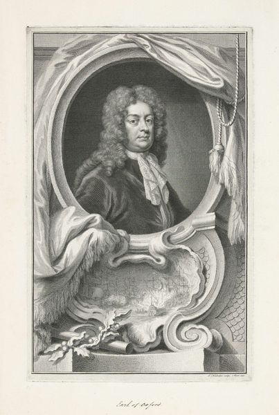 Curator: This is a 1741 engraving by Jacob Houbraken, titled "Portret van William Wyndham," housed here at the Rijksmuseum. Editor: The overwhelming impression is one of constructed power, from the ornate frame to that imposing wig. He's the picture of privilege. Curator: Indeed. Consider how the circular frame isolates him, elevating him to an almost classical ideal, reinforced by the carefully placed drapery. And note the symbolic elements at the base—a caduceus and shield, suggestive of statesmanship and protection. Editor: It is certainly deliberate—the artist meticulously orchestrates visual cues. Wyndham's gaze meets ours head-on. Who was he in relationship to his society? Who was this man in the framework of labor relationships and historical moments? It strikes me that this is someone with something to lose, propped up by all kinds of social powers and forces. Curator: Semiotically, those "powers and forces" are communicated with tremendous effectiveness. Observe the complex interplay of lines creating tonal contrast to indicate depth. Editor: Precisely. The composition directs your eye upwards. It centers on this gentleman’s face, which feels like a missed opportunity—especially considering his social standing, how is he holding up that legacy in this era of constant conflict? Does this resonate with an attempt to conceal, or perpetuate injustices through carefully managed visuals? Curator: You're raising questions that exist outside the work itself. Focusing internally, we can appreciate Houbraken's skillful use of hatching and cross-hatching to achieve a rich sense of texture. Editor: And I’m raising questions which this artwork then represents, a historical and cultural snapshot. The power of such imagery does, I feel, stem from and also reinforces that socio-political world. Curator: Undoubtedly, the visual language employed serves specific intentions. The detail certainly speaks to craftsmanship, but beyond that, it's how that form is meticulously rendered. The objective is power and status. Editor: Leaving us to think about all those who remain faceless in this era because, unfortunately, representation equals visibility equals legitimacy. A sobering, yet critical perspective in confronting artworks such as these.