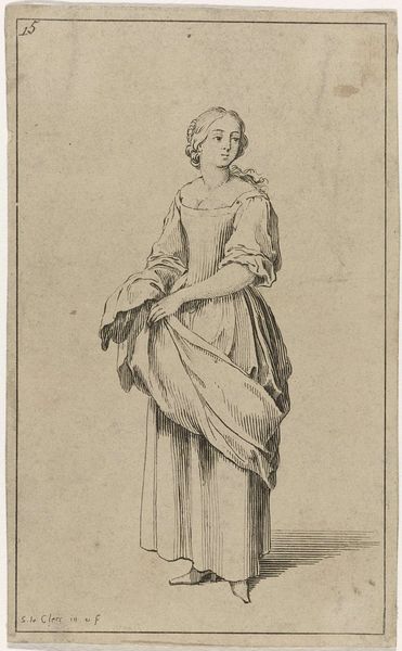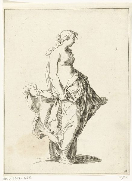 Frederick Bloemaert created this small etching, titled "Young Woman," around 1630. At first glance, you'll notice the stark contrast between the delicate lines forming the figure and the blank space surrounding her. The woman’s body is draped in fabric, which is meticulously detailed with cross-hatching to create depth and shadow. Bloemaert masterfully uses line to define form, creating a sense of volume and texture. This emphasis on line can be understood within the context of formalist principles, where the intrinsic elements of the artwork—line, form, and composition—take precedence. The woman's posture and the way the fabric clings to her body evoke a sense of classical sculpture, yet the etching's medium and scale bring it into a more intimate and accessible realm. Notice how the figure's gaze is directed downward, inviting the viewer to contemplate her inner world. This introspective quality, combined with the formal precision of the etching, encourages a dialogue about representation and perception, leaving us to question the nature of the gaze itself.