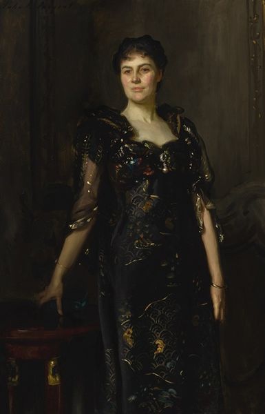 Curator: Let's spend a few minutes with John Singer Sargent’s "Madame Paul Escudier," painted in 1882. The somber color palette immediately strikes me. Editor: Yes, it's a portrait swathed in these deep blues and browns—almost oppressive, even with the burst of light from the window behind her. There's a formality but also a subdued emotion that I find fascinating. Who was Madame Escudier? What's her story? Curator: Beyond the story we might construct around her, consider Sargent’s labor: the weave of the canvas, the blend of pigments. Oil paint lends itself beautifully to capturing the texture of that satin gown, its folds shaped not just by gravity but also by whalebone and social expectation. This materiality speaks volumes. Editor: Agreed, and think about how Sargent's choices serve to position his subject. The setting—a wealthy woman’s parlor, a manufactured and meticulously constructed reality. This portrait is as much about class as it is about the individual. The artist deliberately invites these readings. Curator: And he's so good at creating this interplay of textures – the rug, the dress, the velvety chair that’s mostly cut out of the frame, creating depth and interest. He's highlighting the luxurious environment in a manner aligned with consumer culture—the commodification of artistry, really. Editor: Precisely. We need to consider the societal expectations and constraints placed on women of Madame Escudier's social standing, the male gaze at play. How does that intersect with Sargent's own identity as a portraitist catering to a specific social strata? Curator: Well, we know Sargent moved easily among the elite; his success depended on commissions from figures like Madame Escudier. He captured their likeness, their taste in fashion, in furnishings… He documents a particular moment in the history of material culture. Editor: These commissions, and the art that emerged from them, solidified societal hierarchies and dictated definitions of beauty and prestige. To understand this portrait fully, we must examine the power structures in place at the time, the inequalities that underpinned its creation. Curator: That close analysis is essential. When I look at "Madame Paul Escudier" I’m reminded how artists' hands are always involved in more than artistic expression, deeply entwined in social dynamics. Editor: Absolutely. Thinking about Sargent, about Madame Escudier, challenges me to critically assess art's role in perpetuating social and economic narratives, even today. Thank you for offering your insight on this compelling portrait.