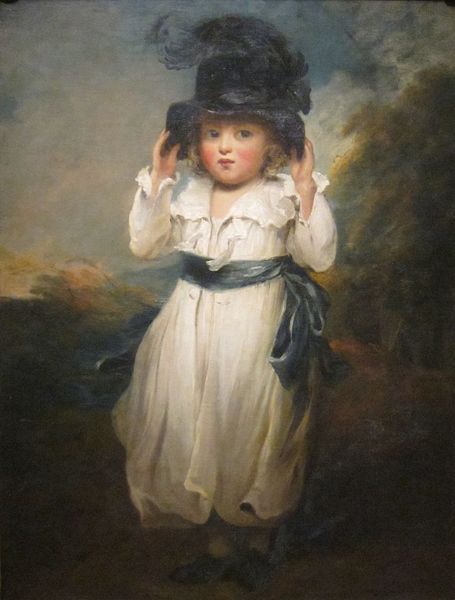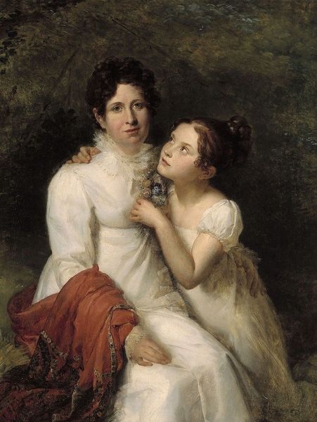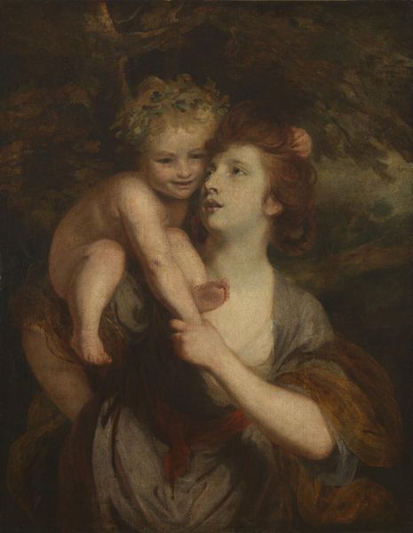 Editor: This is “Mrs. Graham Young and child,” painted around 1810 by Henry Raeburn, using oil paints. It’s striking how gently the mother regards her child; what stands out to you? Curator: I am struck by how this painting, at first glance a simple mother-child portrait, evokes layers of societal expectations and enduring maternal symbolism. Observe the rose adorning Mrs. Young's cap – a subtle, yet powerful emblem. Editor: An emblem of what exactly? Curator: Traditionally, the rose embodies beauty, love, and secrecy, often linked with Venus, the goddess of love. Yet, the positioning, almost out of reach from the child, whispers of a controlled, idealized version of motherhood—one tempered by societal constraints. How do you interpret the child's upward reach? Editor: As pure affection? An innocent gesture? Curator: Indeed, yet the upward reach can also signify aspiration, yearning for something just beyond grasp. This simple act, coupled with the rose’s placement, offers a fascinating contrast. Raeburn captures both the natural bond between mother and child, and the prescribed roles they were expected to fulfill. Does the mother look pleased? Or melancholy? Editor: There's a touch of melancholy, perhaps the weight of those prescribed roles you mentioned. I hadn’t considered the symbolism before, seeing the image as a celebration of motherhood. Curator: Exactly. Raeburn subtly reveals the psychological nuances, making us question whether it is an intimate family moment or performance of familial virtue. It certainly changes our perception. Editor: It truly does. Thanks, that was incredibly insightful!
