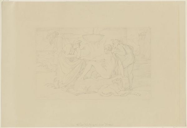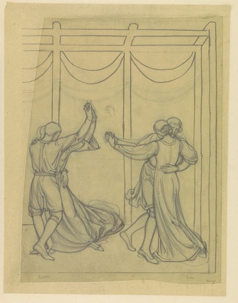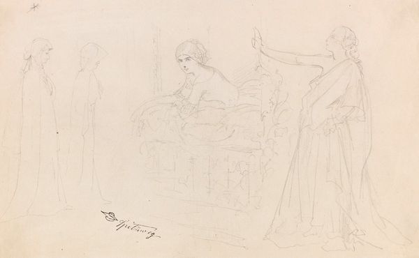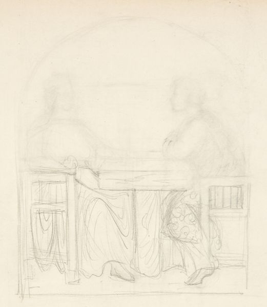 Agnes Slott-Møller made this preparatory sketch for "Jomfru Blidelil" with graphite on paper. I love how you can see the artist thinking through the composition here, the ghostly lines and erasures show art-making as a real process. The tentative lines create a delicate, ethereal quality, especially in the figure on the left. Her form is barely there, like she might float away at any moment. The other figure, leaning on the table, is more grounded but still rendered with a light touch. Look closely at the window behind them. The bars create a grid that traps the figures in place. It reminds me a bit of Hammershøi, with its quiet interiors and muted tones, though Slott-Møller brings a more symbolic, almost dreamy quality to her work. This piece feels like a conversation between artists across time, each exploring their own vision of the world. It reminds us that art is never finished, always open to interpretation.