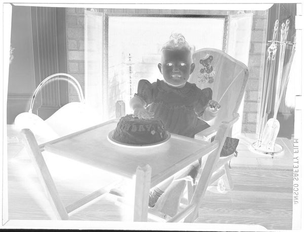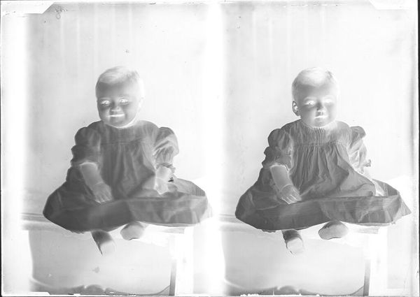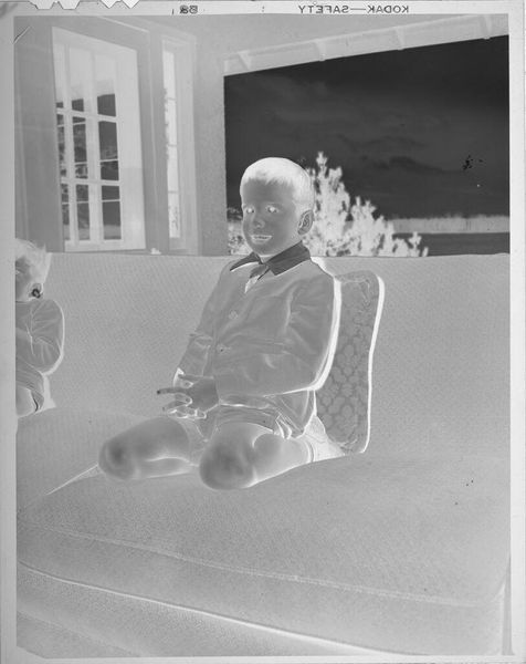 Editor: This is an untitled photograph by Lucian and Mary Brown, it features a little girl on a couch, and the high contrast makes it very striking. How do you interpret this work through its formal elements? Curator: Note how the inverted tones create an unsettling yet compelling visual tension. The rigid geometry of the window contrasts with the soft, organic forms of the plants and the child. This juxtaposition invites us to consider the photograph's inherent structural dichotomies. Editor: So the deliberate contrast creates meaning? Curator: Precisely. The interplay of light and shadow, form and texture, transforms a simple domestic scene into a study of visual opposition. It's a fascinating articulation of photographic language. Editor: I never thought of it that way. I was only seeing a child, but its visual vocabulary is so powerful.