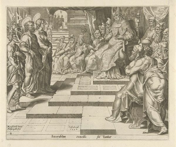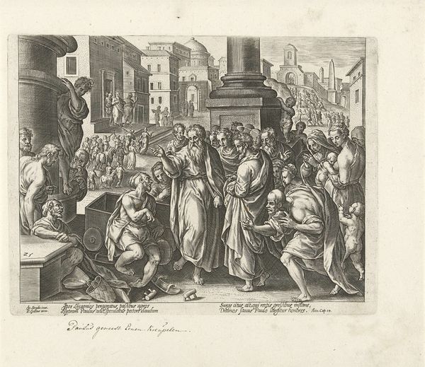 Curator: The image before us is an engraving entitled 'Preek van de apostel Petrus: 'de vergeving van de zonden,'' or "Sermon of the Apostle Peter: 'The Forgiveness of Sins'" by Johann Sadeler I, created in 1579. It's currently housed in the Rijksmuseum. The composition immediately strikes me—the linear precision, the crispness of the engraving, the architectural backdrop adding depth and structure... It's all so meticulous. Editor: My first impression is the powerful narrative it conveys. Peter's commanding presence draws the eye, while the surrounding figures show a diversity of reactions, creating a very human, relatable scene. I immediately wonder, what narrative does this engraving insert itself into, and what stories might it obscure? Curator: Formally, the composition centers around Peter. Note how Sadeler uses line and shadow to give Peter’s figure depth and authority. The orthogonal lines of the architecture subtly direct our gaze towards him, underscoring his central role in the narrative. What does the rendering technique employed here convey about religious themes in the baroque era? Editor: Well, given its historical context, created amid religious and political upheaval, this piece resonates deeply. Sadeler was working during a time of immense religious conflict, so his depiction of Peter preaching forgiveness serves as a powerful assertion of the role forgiveness can have on human connection in chaotic eras. Look at the varied reactions of those listening—acceptance, skepticism, introspection—it suggests an active, not passive, engagement with the message, mirroring the debates within Christianity itself. Curator: Yes, but by using clear, distinct lines and meticulously rendered figures, Sadeler isn’t just presenting a scene but also structuring an argument—one about clarity, order, and divine authority. The balance in the artwork serves to affirm this divine authority that both demands adherence but invites it in equal measure. The message lies in its formal structure and meticulousness. Editor: I understand. I find myself gravitating toward the figures themselves – the marginalized, the dispossessed seeking solace in Peter's words. How might the inclusion of this diversity represent or reimagine societal relationships of the era, giving voice to different genders, age groups, and social classes within an established, authoritative Church? Curator: It’s fascinating to consider how formal qualities and social context inform our understanding. I leave feeling that an artwork, like any successful persuasive document, cannot present such profound subject matter with just technique; indeed, it invites all elements to present an active and convincing argument to its audiences. Editor: For me, it brings a new layer to understanding the narratives shaping religious reformation, urging all contemporary viewers to reconsider assumptions we bring to such an artwork—ultimately prompting dialogue with each other and our shared history.
